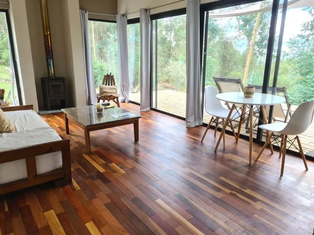 En el living comedor cuenta con 1 sillón cama de plaza y media, estufa eficiente de doble combustión, kitchenette con frigobar y cocina a gas con horno y 4 hornallas, cafetera italiana, vajilla y terraza panorámica con fogón y parrillero con vistas al bosque y las sierras.