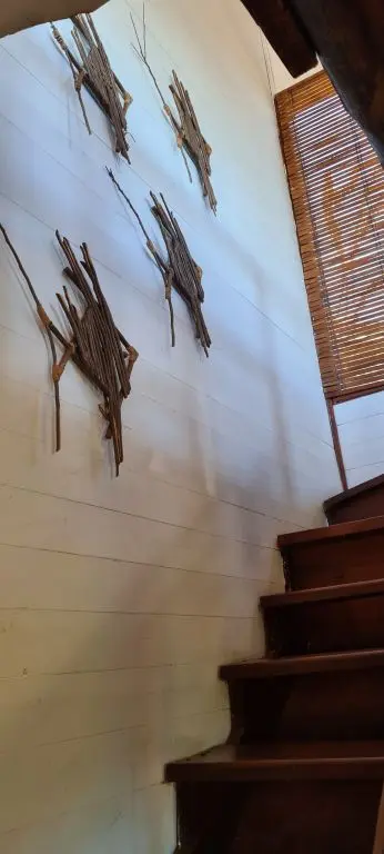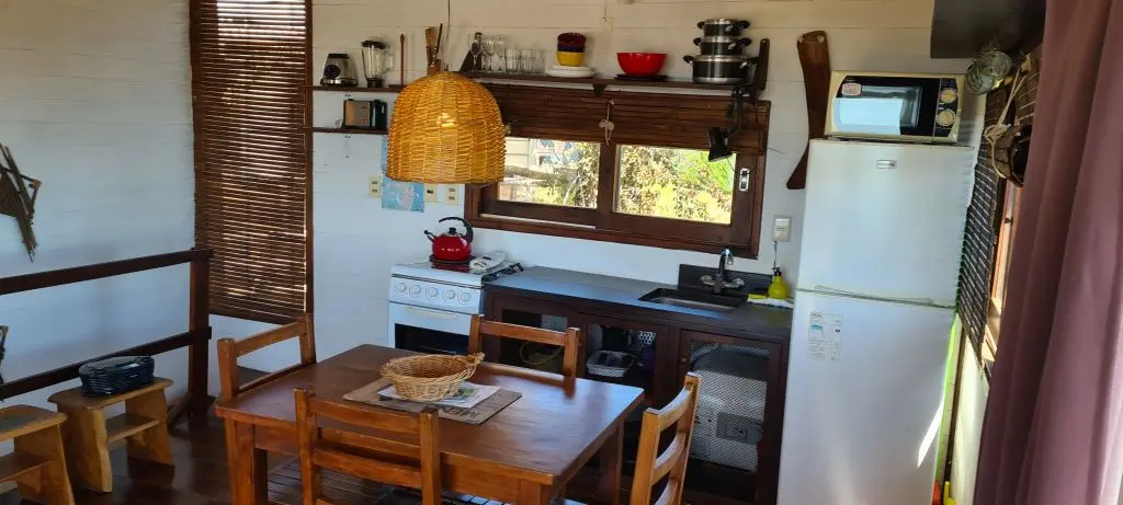 Planta Alta: Cocina Integrada y totalmente equipada con pequeños y grandes electrodomésticos + Comedor para 4 personas + Living con un Sofá Cama de una plaza y Mesa Ratona, Estufa a Leña/Chimenea, Amplios Ventanales que permiten apreciar Excelentes Vistas y tener una Buena Ventilación Cruzada.