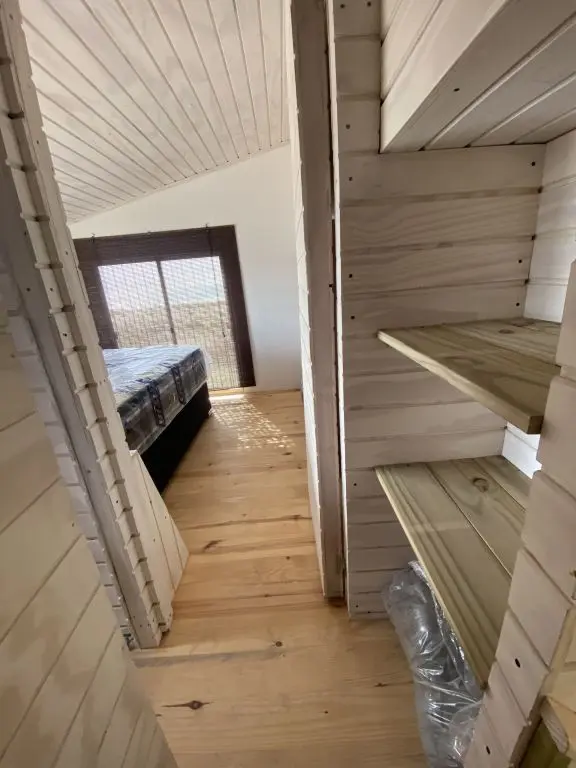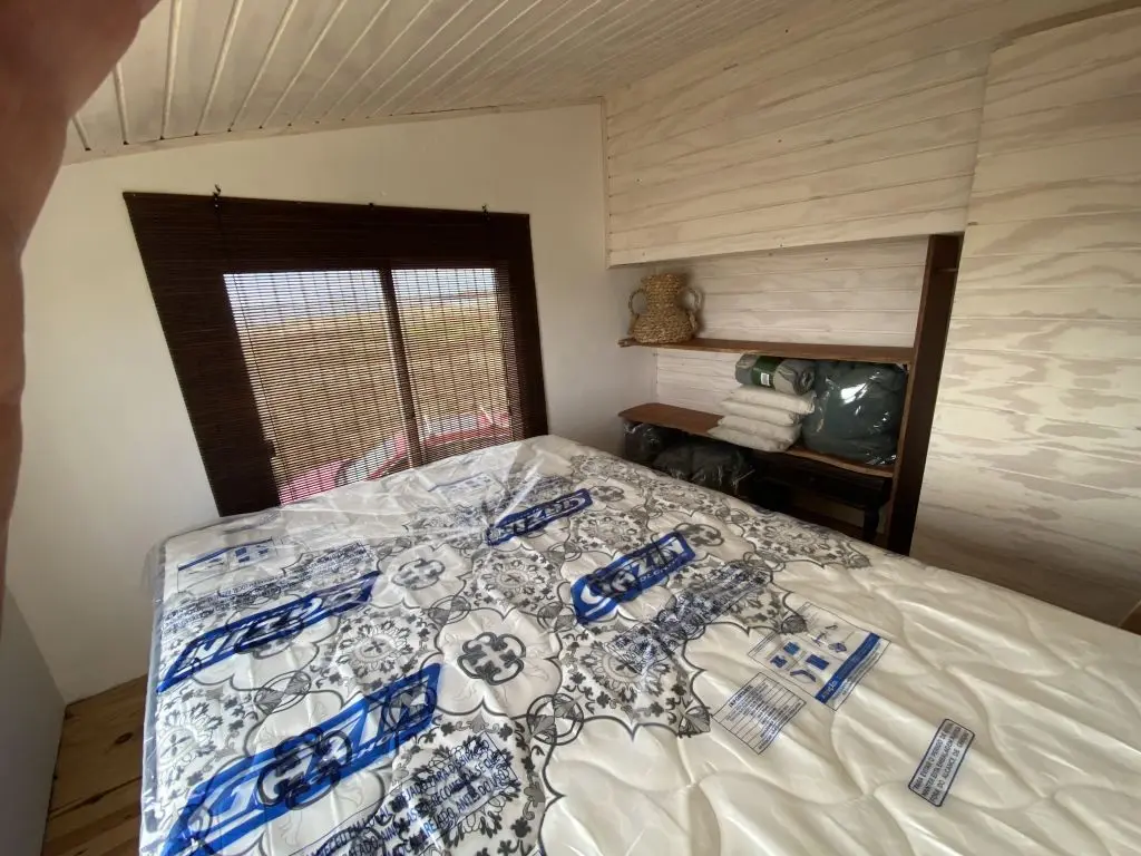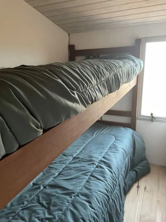 La casa tiene dos dormitorios bien definidos en planta alta para cuatro personas. Uno con cama matrimonial, y una increíble vista al océano y a las islas de lobos. Otro pequeño con una cama cucheta.