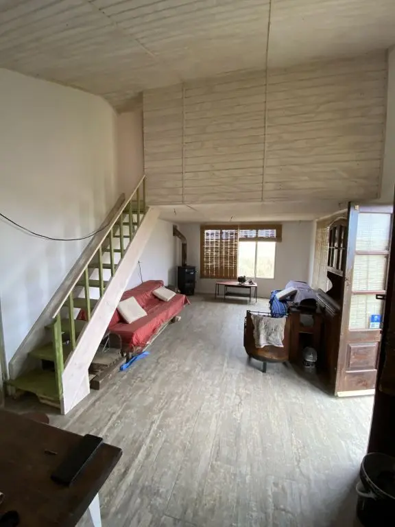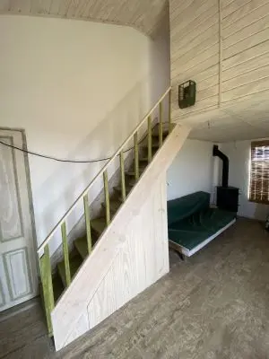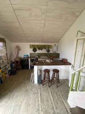 En planta baja tenemos dos sofá cama (una marinera), como para que algunos invitados puedan pasar una noche, o como para que hasta 6 personas convivan utilizando la sala de estar. Por si acaso da en verano, y ni que hablar fuera de temporada en las frias noches del Cabo, tenemos una estupenda estufa de hierro con horno. La cocina está integrada al ambiente, con una barra que hace de mesa de comedor.