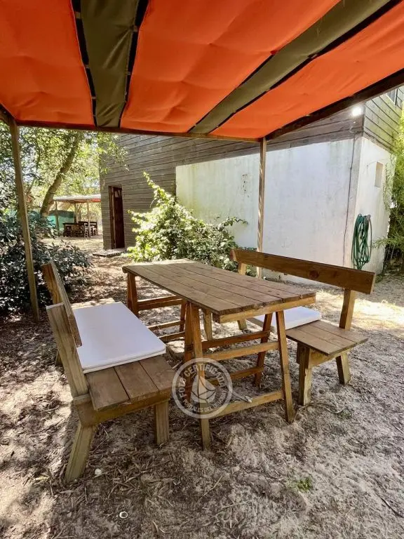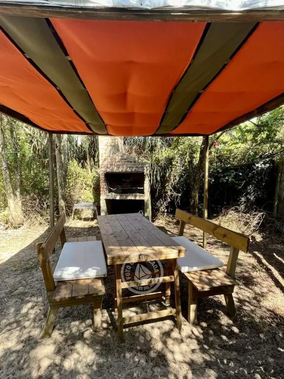 La cabaña cuenta con deck, sombraculo cercano al parrillero de techo impermeable con protección UV