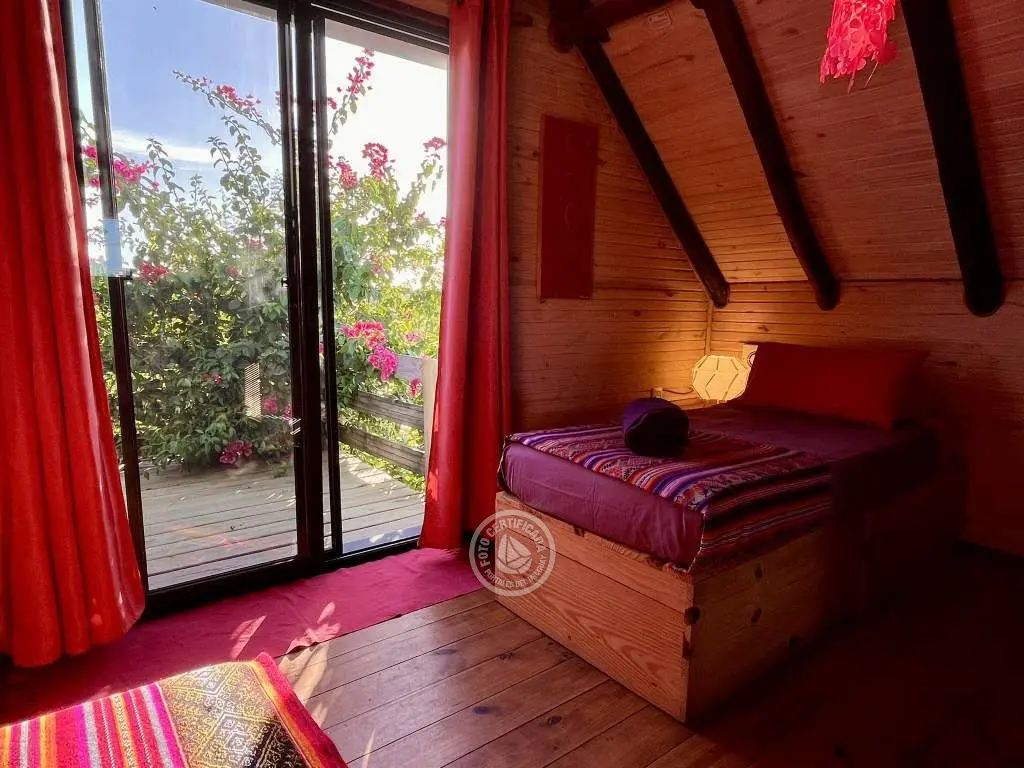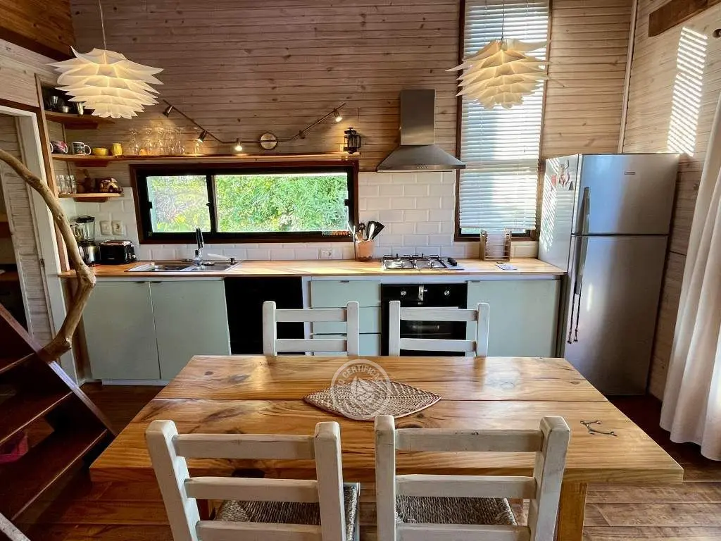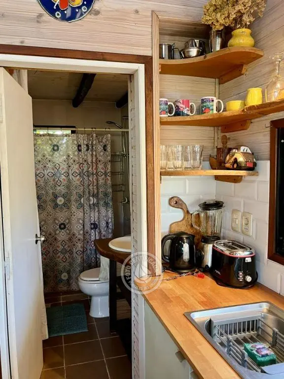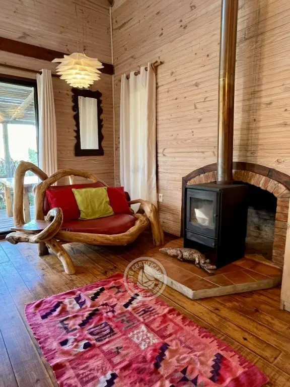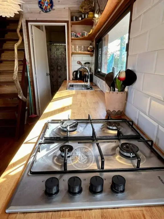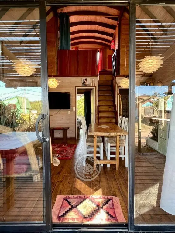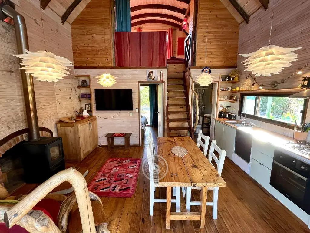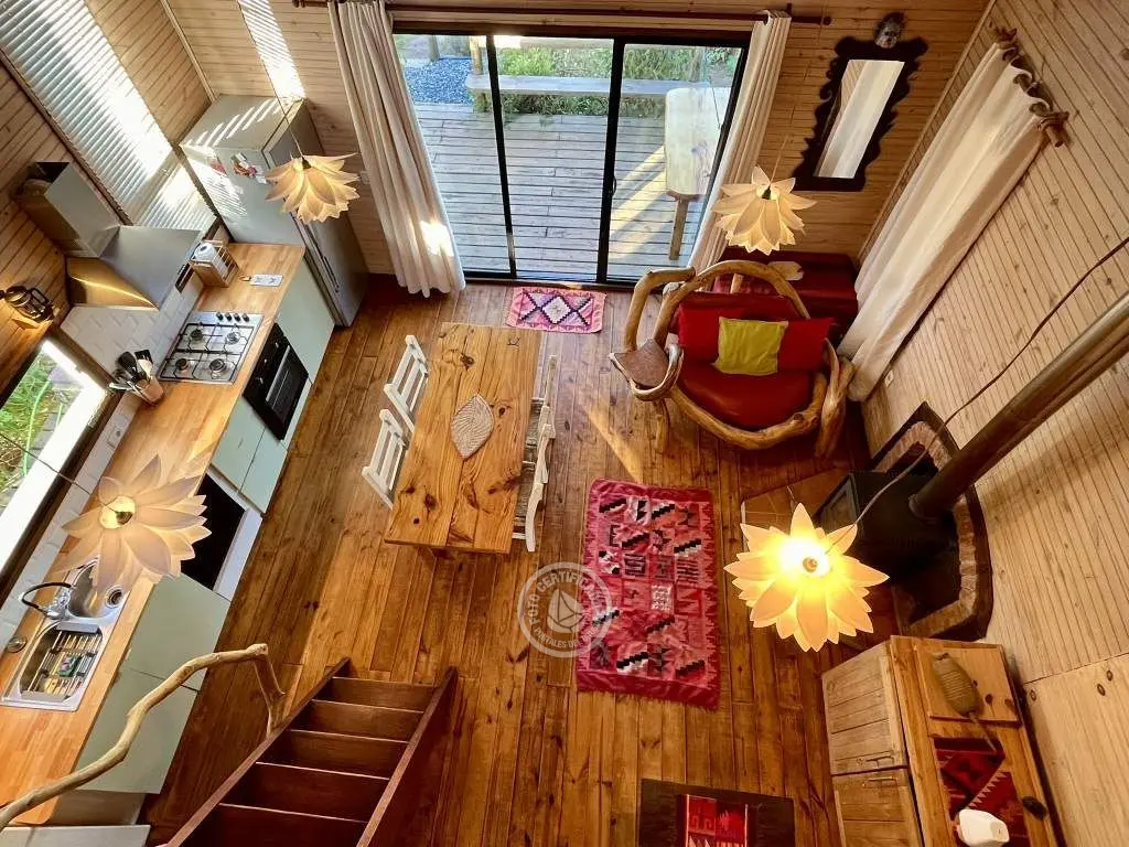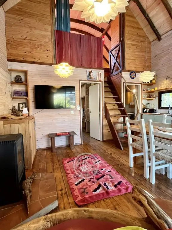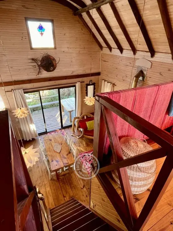 Cabaña de techo curvo con entrepiso y estufa a leña para 2 a 4 personas.