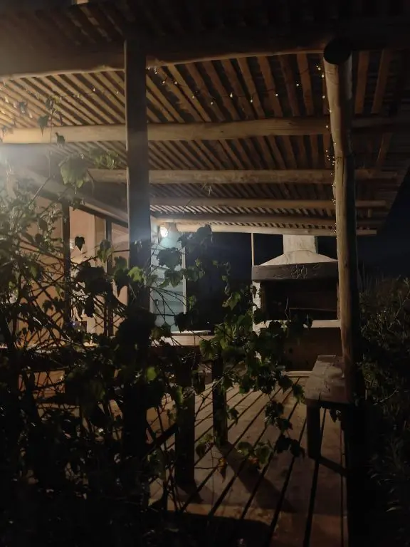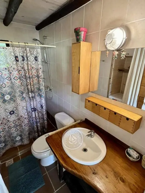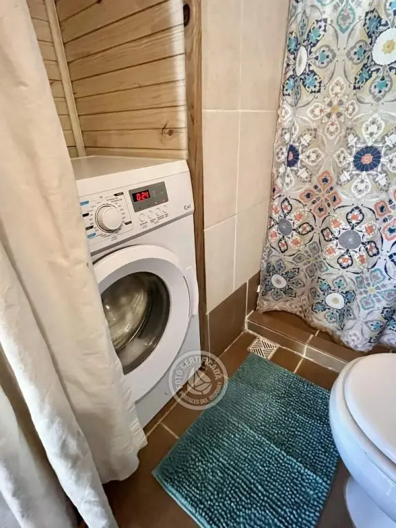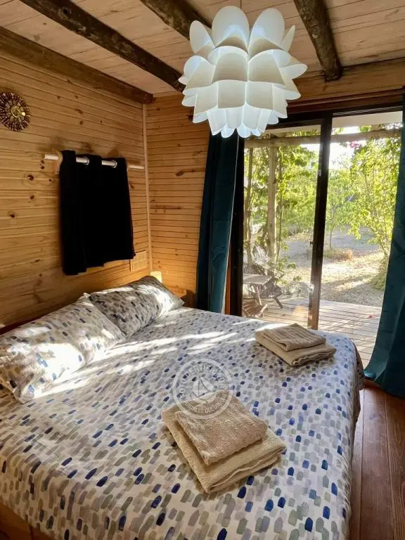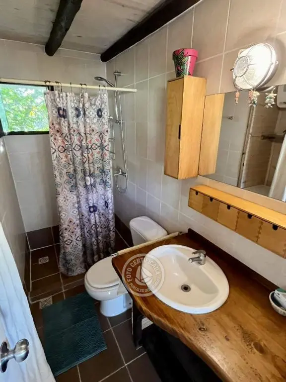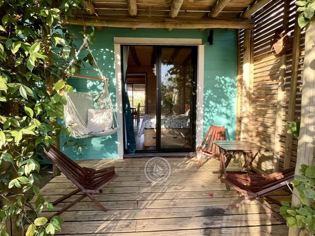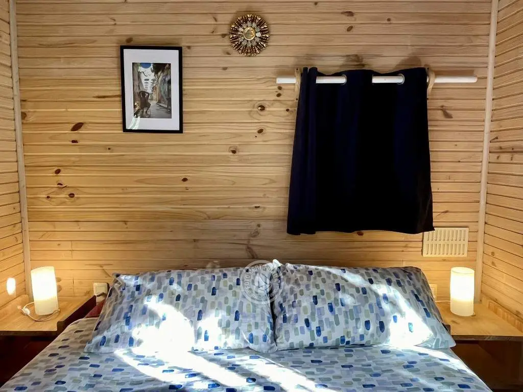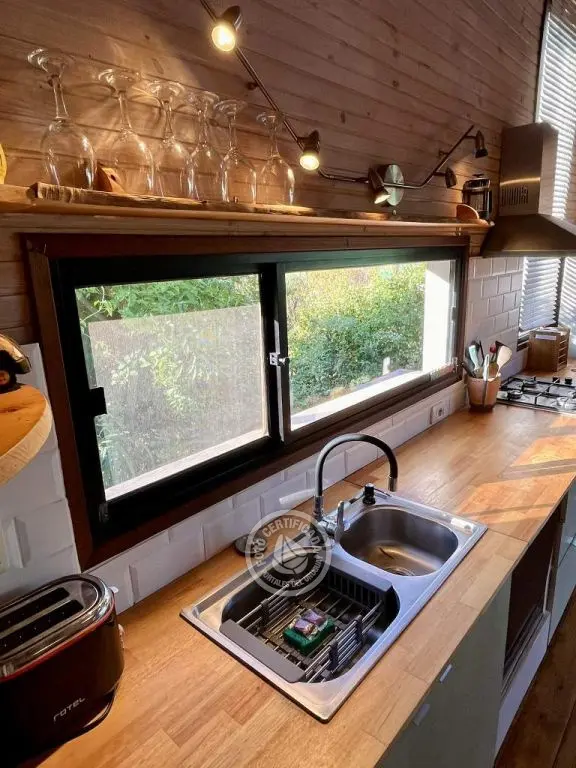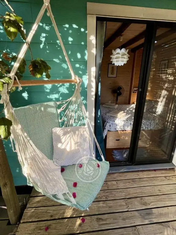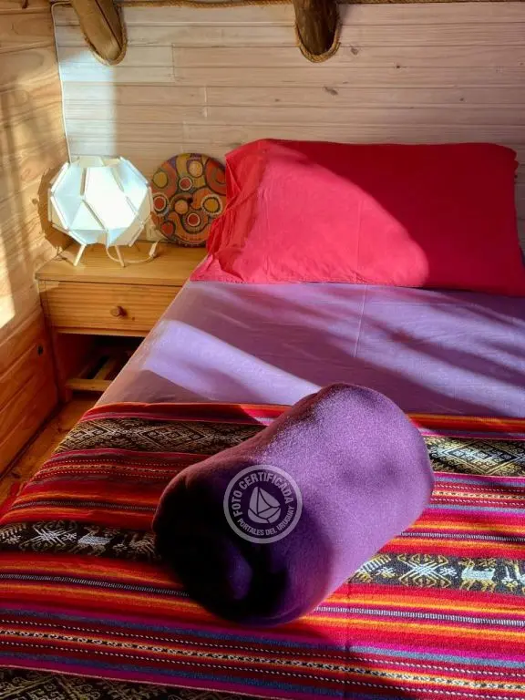 Cabaña de techo curvo con entrepiso y estufa a leña para 2 a 4 personas.
