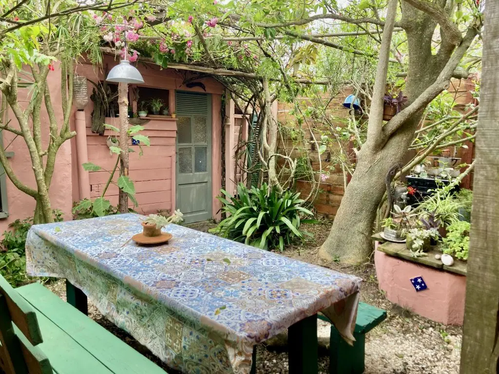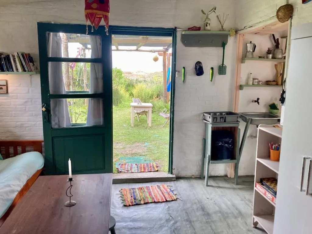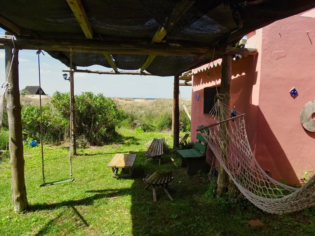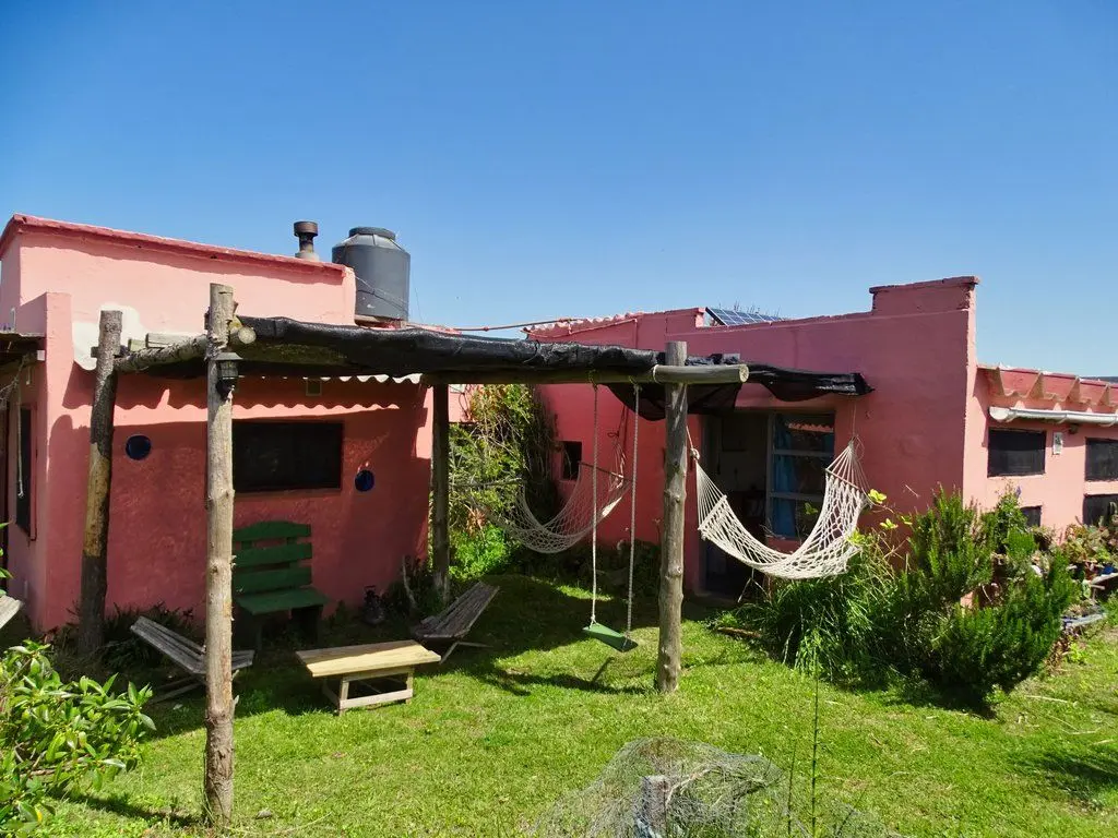 Casa estilo monoambiente para 4 personas, cuenta con una cama matrimonial y una cucheta. La cocina es pequeña pero super completa. Tiene un hermoso jardín florido para descansar en las horas de sol, y un alero con hamacas con vista al mar. Luz y agua caliente. Buena biblioteca, juegos de mesa. Muy acogedora! El barrio es super tranquilo, no se permiten ruidos a partir de medianoche. Si buscas tranquilidad, es aquí!