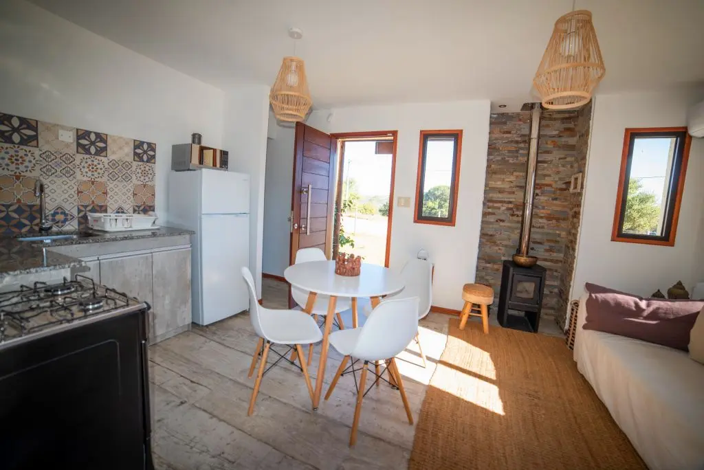 Cuenta con Wifi sin costo, Netflix gratis en dormitorio, AireAcond./ estufa a leña, DirectTv, cocina completa, amplio deck, agua caliente y parrilla. Cerca del Baño de la India y de muy facil acceso a la zona.