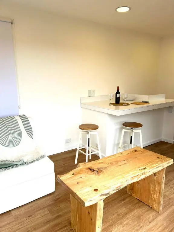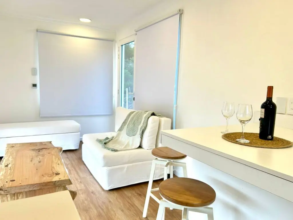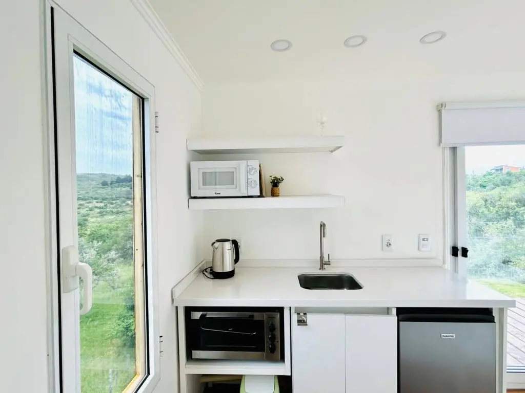 El interior cuenta con todo lo necesario para una estadía agradable, desde una pequeña cocina (frigobar, horno eléctrico, microondas, jarra eléctrica, hornalla de inducción, vajilla) hasta un acogedor espacio para descansar y disfrutar del paisaje.