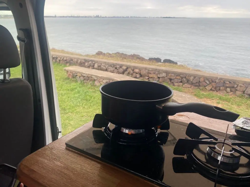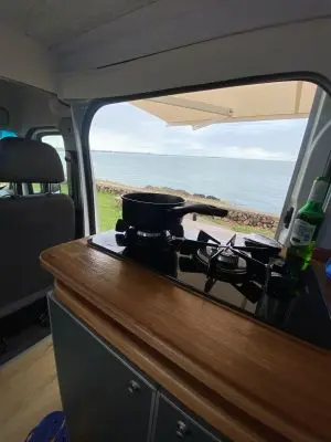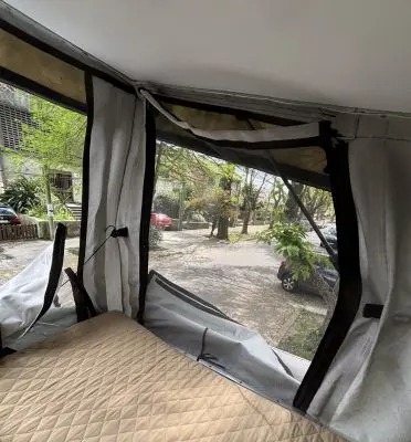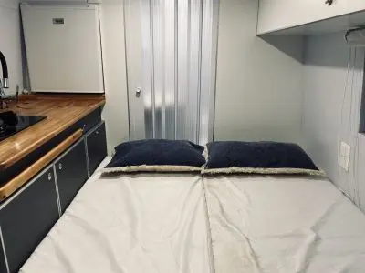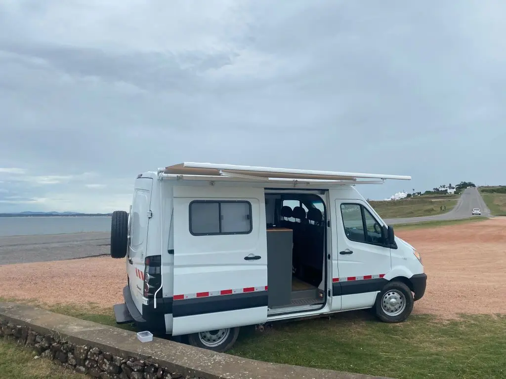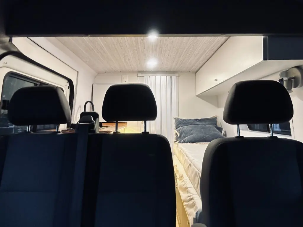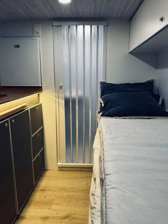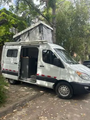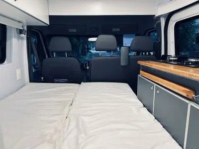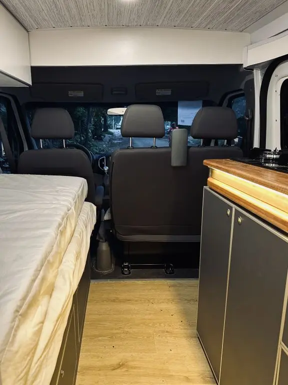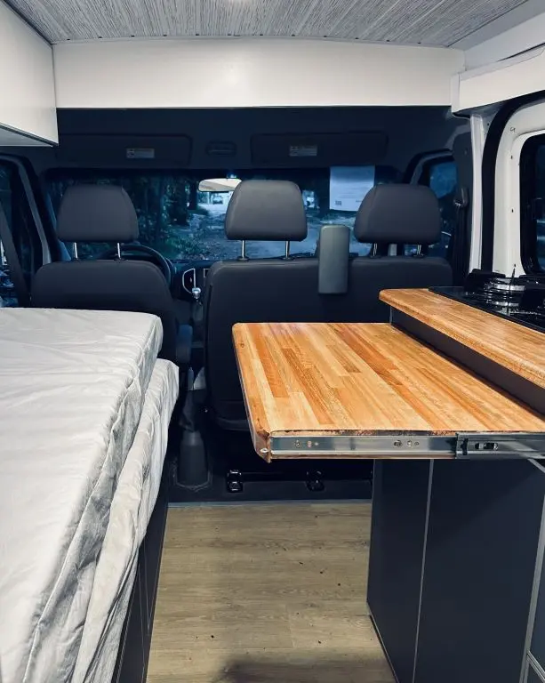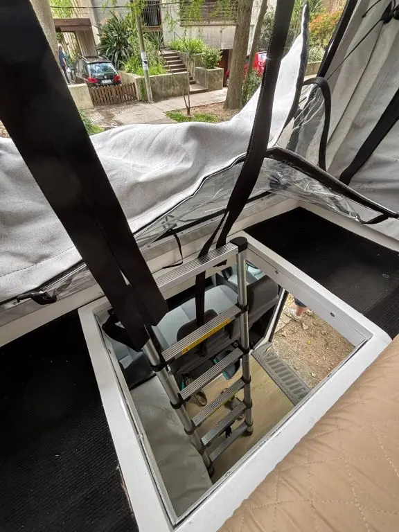 Cuenta con todo lo necesario, salón / dormitorio, ducha, WC químico, ducha, calentador de agua, mesada para cocinar con gas, utensillos de cocina, refrigerador, placas solares para tener autonomía eléctrica, cargadores USB, luz interior, posibilidad de conectar ordenador a 220V. Depósitos de agua Limpia y agua gris de 100lts cada uno.