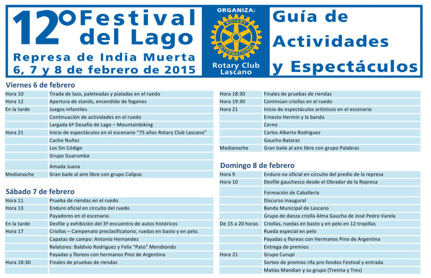 Este 6, 7 y 8 de Febrero 2015 en la localidad rochense de Lascano se vivirá el Festival del Lago de la Represa de India Muerta organizado por el Rotary Club de Lascano, un evento destacado por su carácter folclórico.