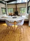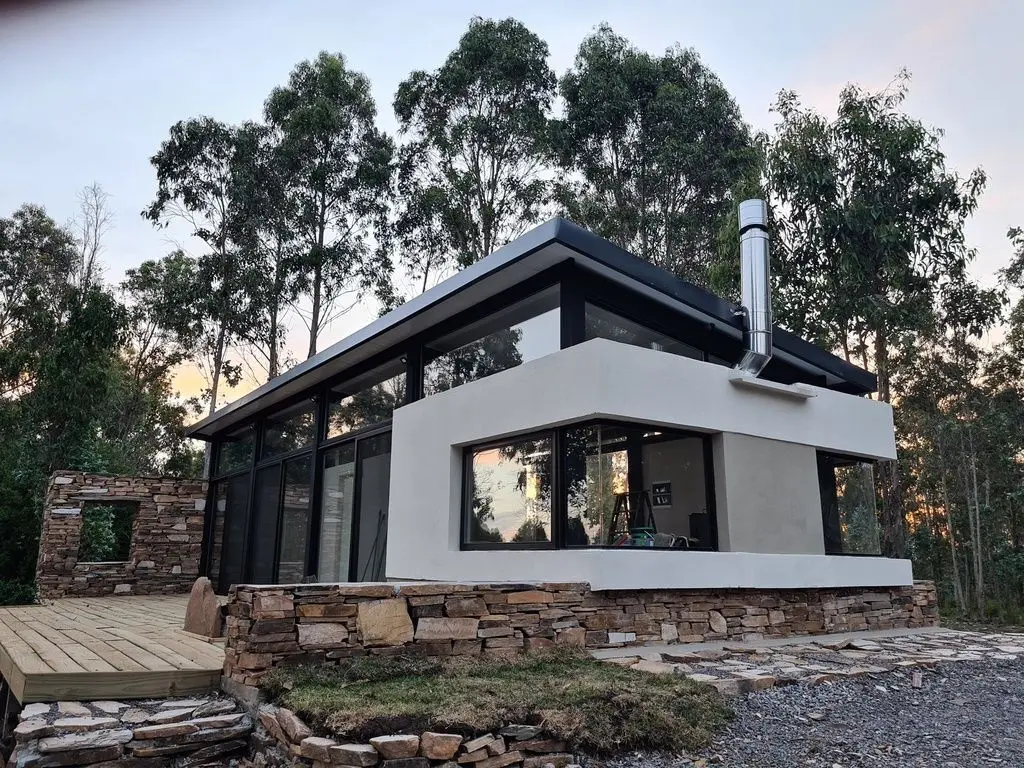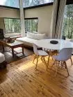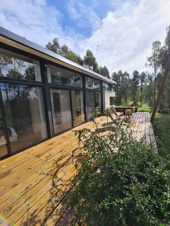 Es una casa ecologica completa con cocina equipada, 2 dormitorios con baño en suite, tres camas de plaza y media con estufa a leña de doble combustión y baño completo. El living comedor esta integrado a la cocina, cuenta con estufa a leña de doble combustión y baño social. Posee deck exterior con parrillero y poltronas para disfrutar de las noches estrelladas, comodamente. Los dormitorios con baño en suite, tienen calefacción por paneles y ventanales orientados a la salida del sol. Puede tener camas dobles o matrimonial.