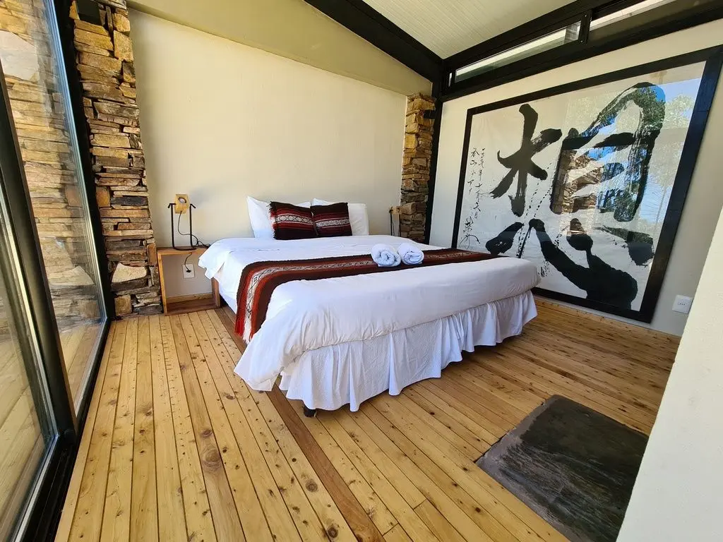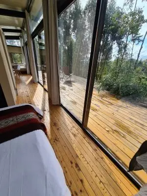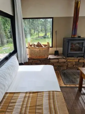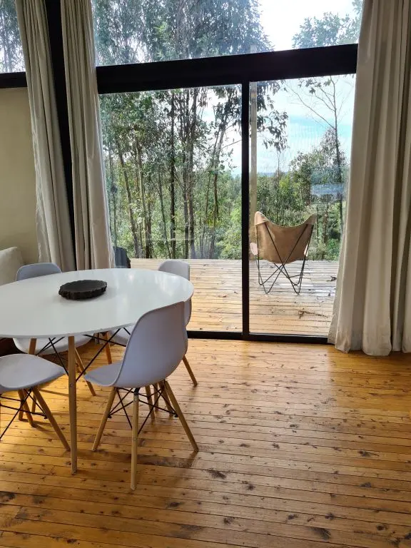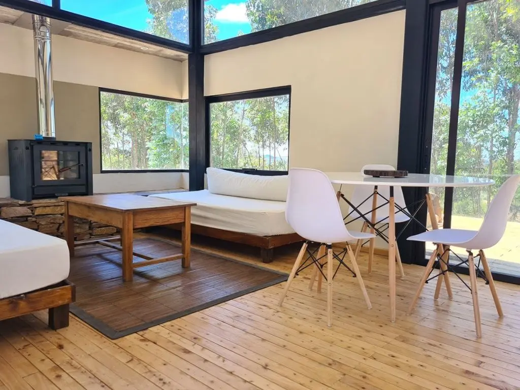 Casa del Bosque es una casa ecologica completa con cocina equipada, dormitorio, dos futones de plaza y media, deck exterior con fogón y poltronas para disfrutar de las noches estrelladas, comodamente. El dormitorio con baño en suite, tiene estufa a leña de doble combustion, ventanales orientados a la salida del sol y puede tener camas dobles o matrimonial con calefaccion por paneles. El living cuenta con dos futones de plaza y media, estufa a leña de doble combustion para el invierno y Aire Acondicionado para el verano