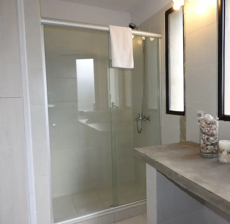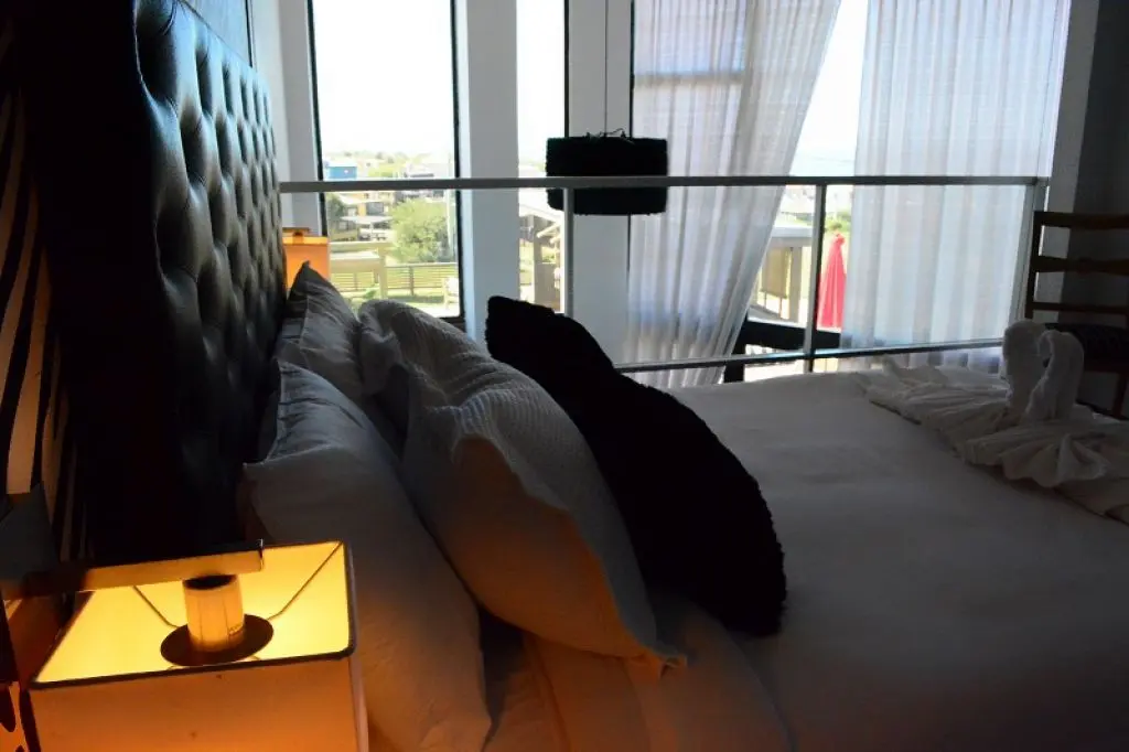 Primer piso: Dormitorio principal con cama matrimonial con colchón de resorte 20 cm, piso flotante, luminaria, cortinas black out y placard. Baranda con vista al mar.