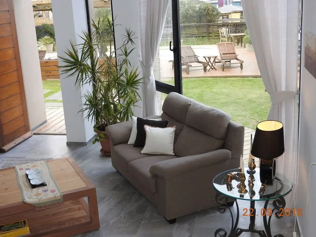 Planta baja: Amplio y moderno living comedor con suelos cementicios, TV LCD 32" para un ambiente distendido y vacacional.