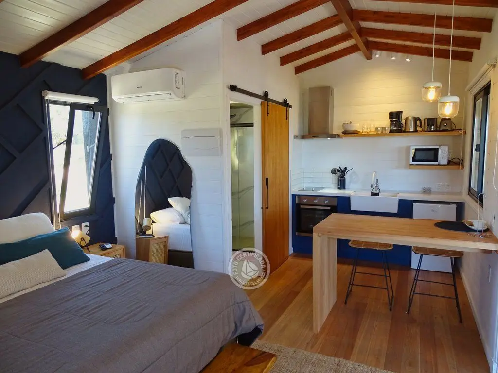Con zona de comedor, TV, baño en suite con ducha, y una cocina completamente equipada con todo lo que el huésped pueda necesitar, incluyendo horno, tostadora, cafetera, microondas, etc. A la comodidad del interior se suma una amplia terraza con mobiliario de exterior y parrillero.