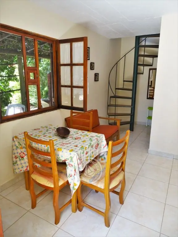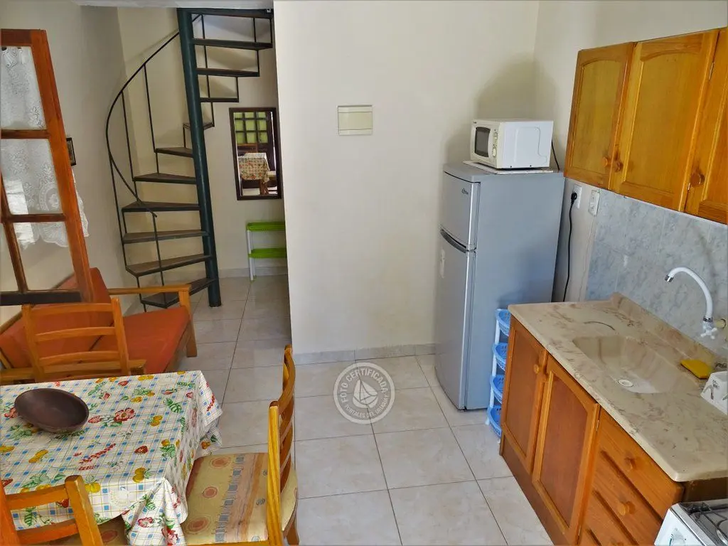 Apartamento para 4 personas en dos plantas, cocina comedor y baño en planta baja y dormitorio con balón en planta alta con aire acondicionado. Parrillero techado y cochera.