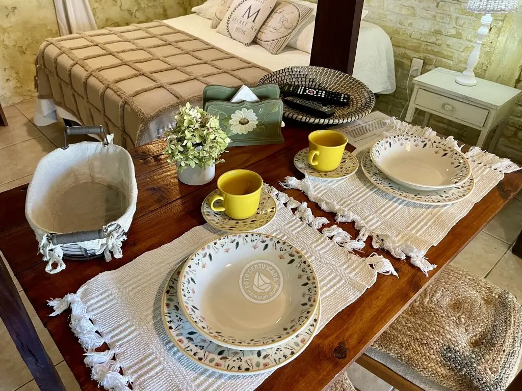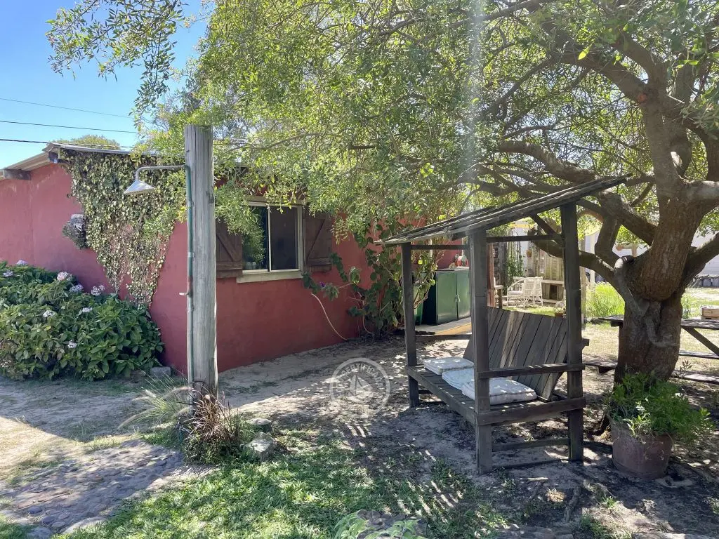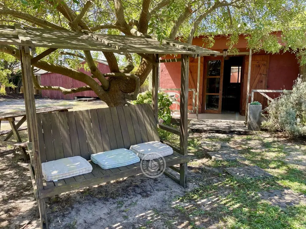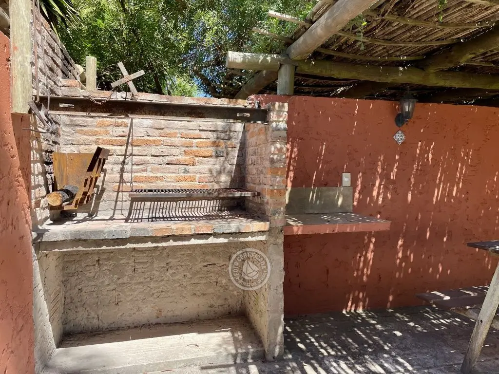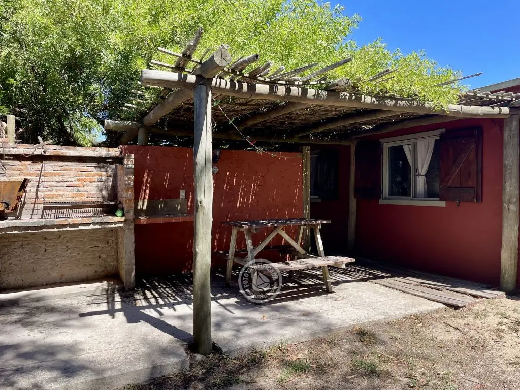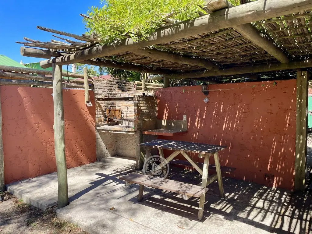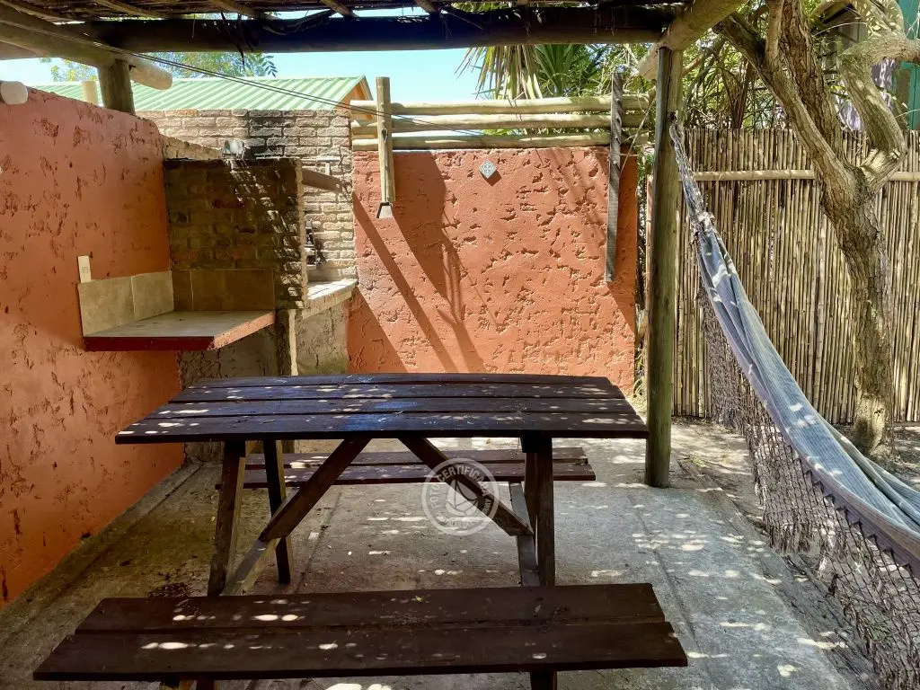 Privado ,con farol para uso nocturno y mesa tipo campo con bancos incorporados .
