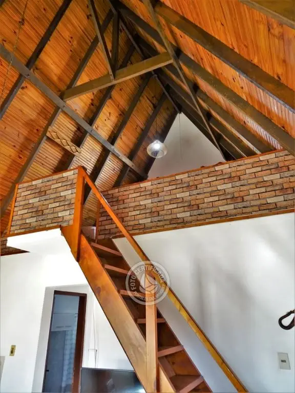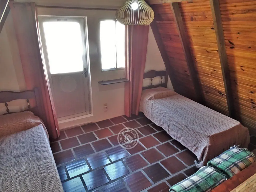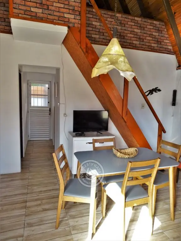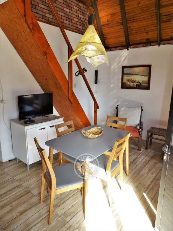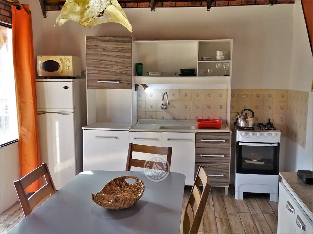 Cabaña para 4 personas. Living comedor con estufa a leña y cocina integrada en planta baja. Dormitorio con cama doble en planta baja. Entrepiso con terraza y dormitorio con 2 camas simples. Parrillero individual.
