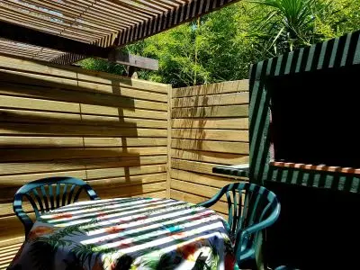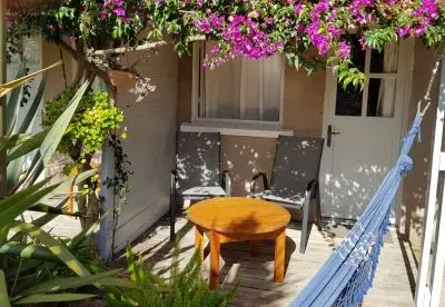 Terraza adelante con dos sillitas, mesita y hamaca paraguaya