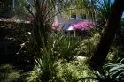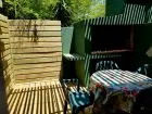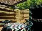 Parrillero individual pergolado al fondo con juego de mesa y sillas de jardín