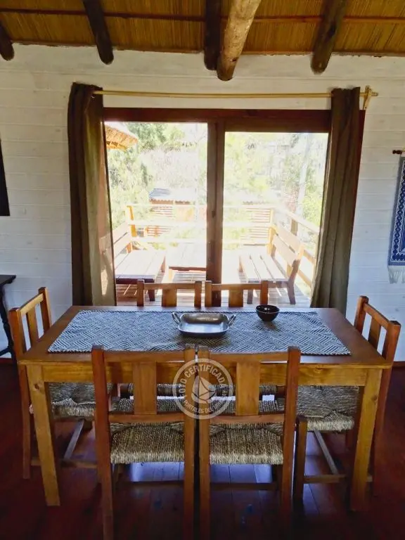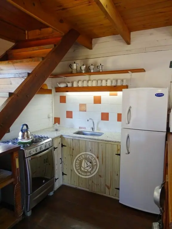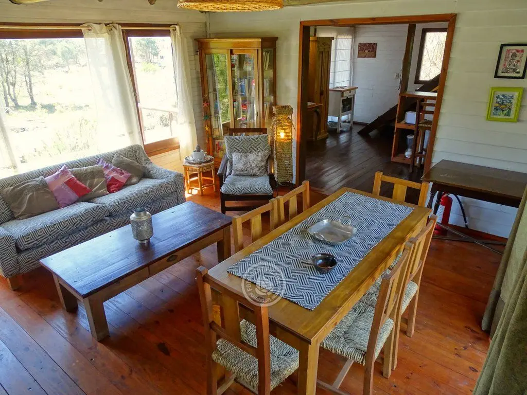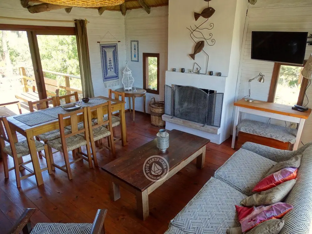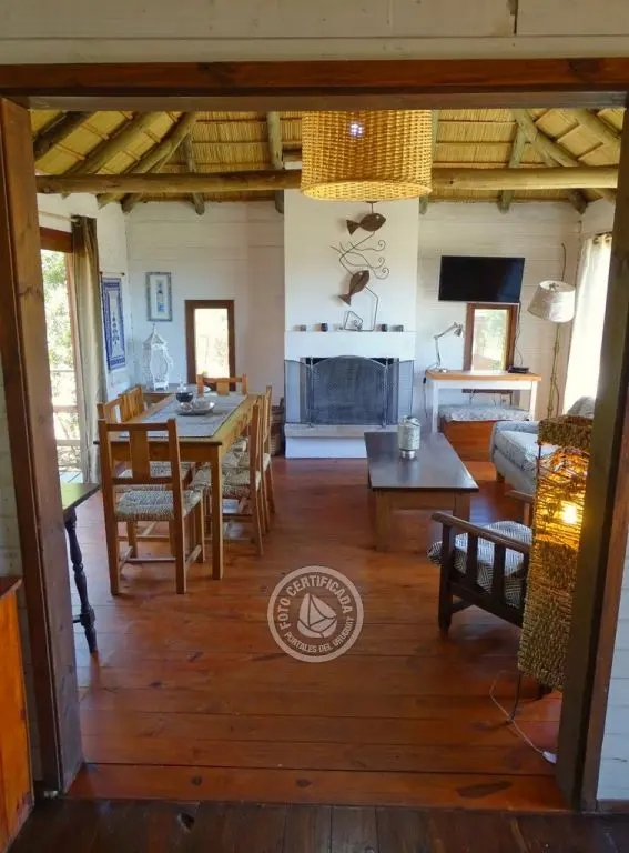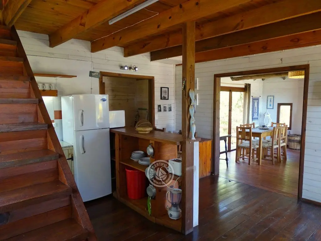 La cocina, completamente equipada, está integrada al living mediante una barra desayunadora. El living es un espacio que invita al relax, con sillones y amplios ventanales con vistas al bosque de pinos y el mar.