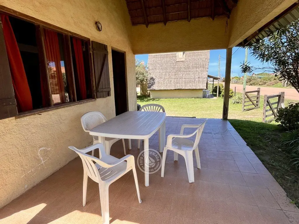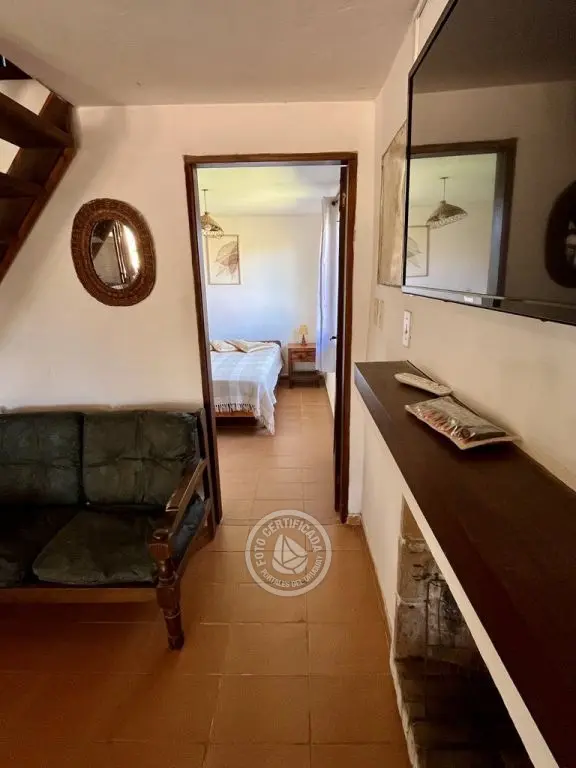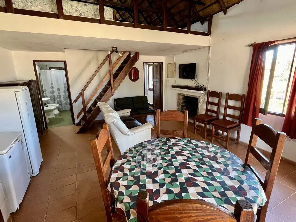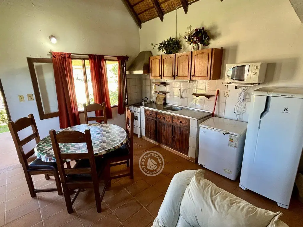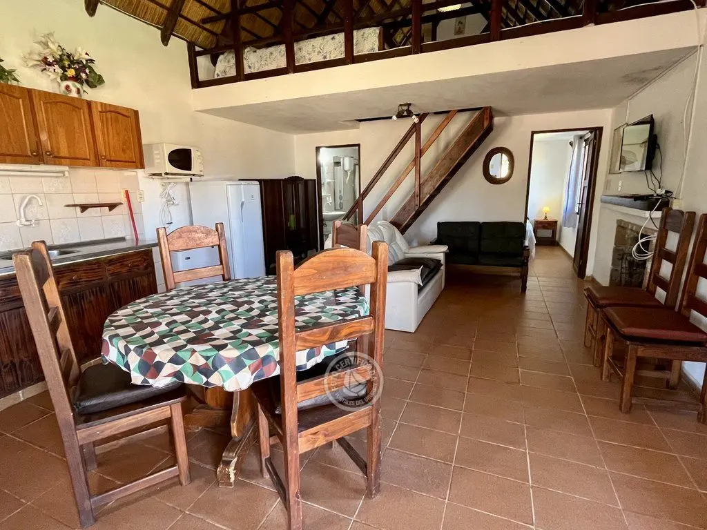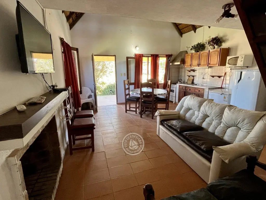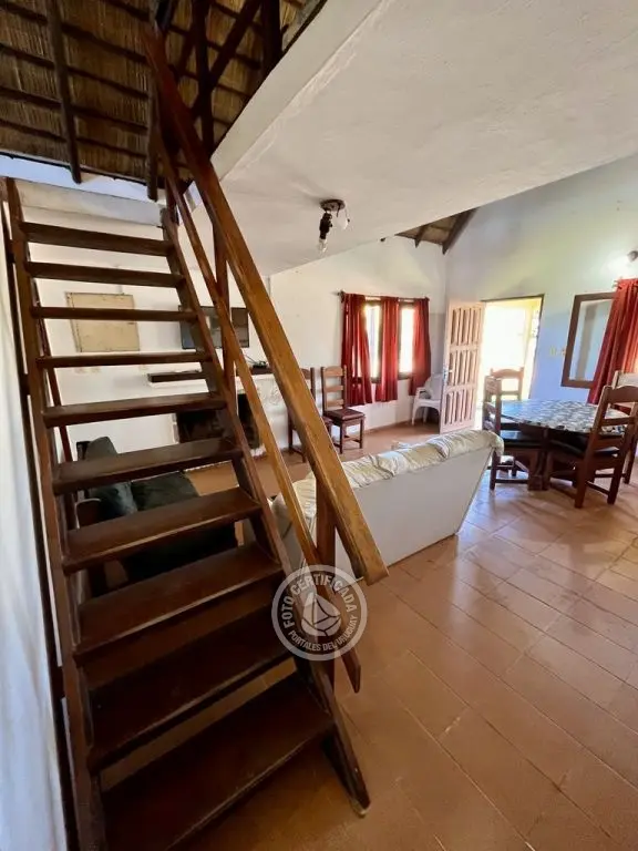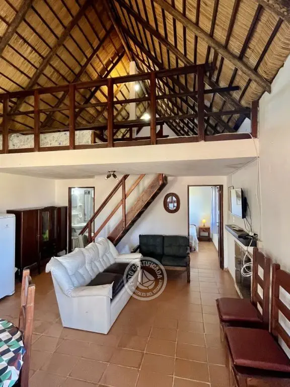 Cabaña de material con techo de quincho. Planta baja con living comedor con cocina integrada, dormitorio con cama doble y baño. Entrepiso con 4 camas simples. Parrillero al fondo con sombra.