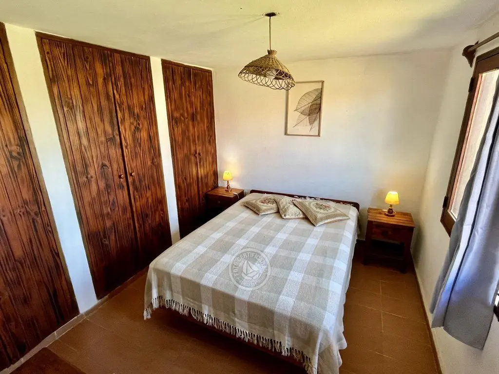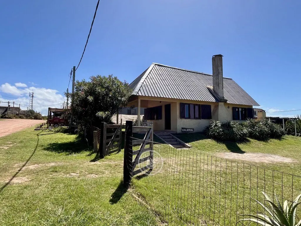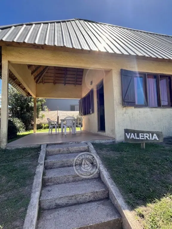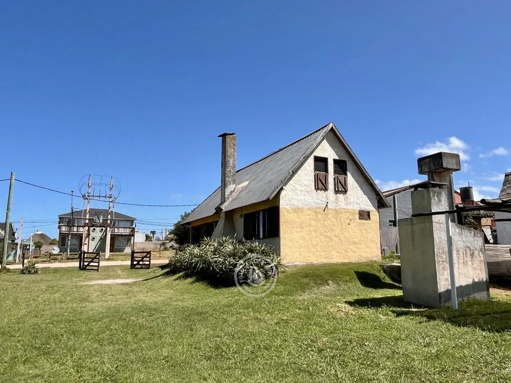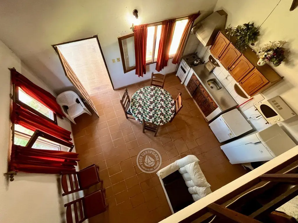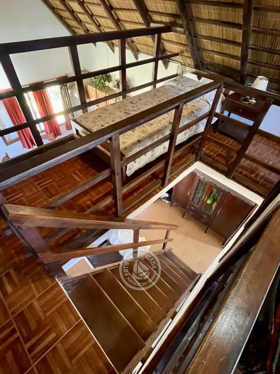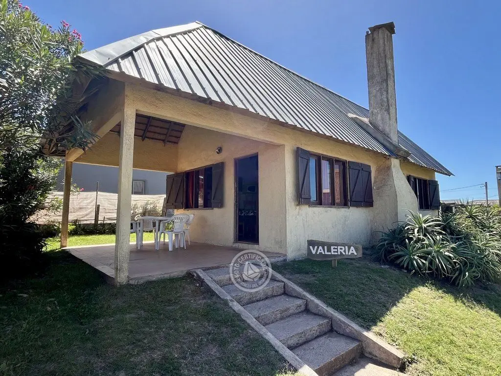Cabaña de material con techo de quincho. Planta baja con living comedor con cocina integrada, dormitorio con cama doble y baño. Entrepiso con 4 camas simples. Parrillero al fondo con sombra.