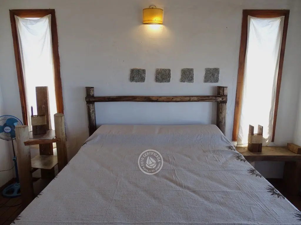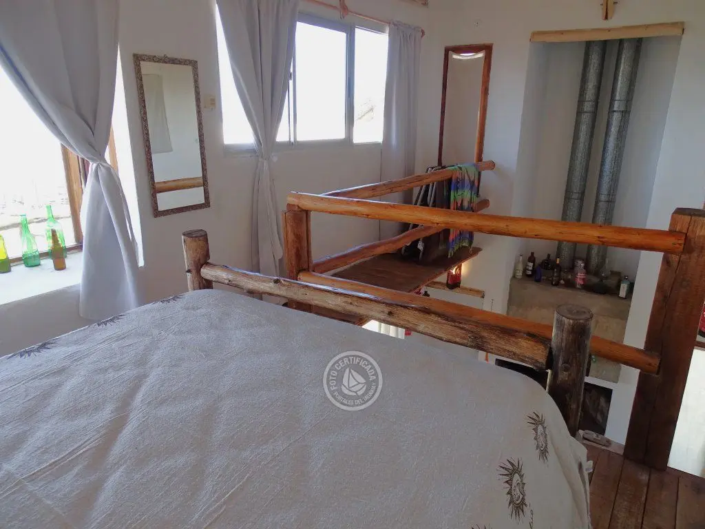 En la planta alta, el dormitorio con cama matrimonial y un gran ventanal con vista al mar.