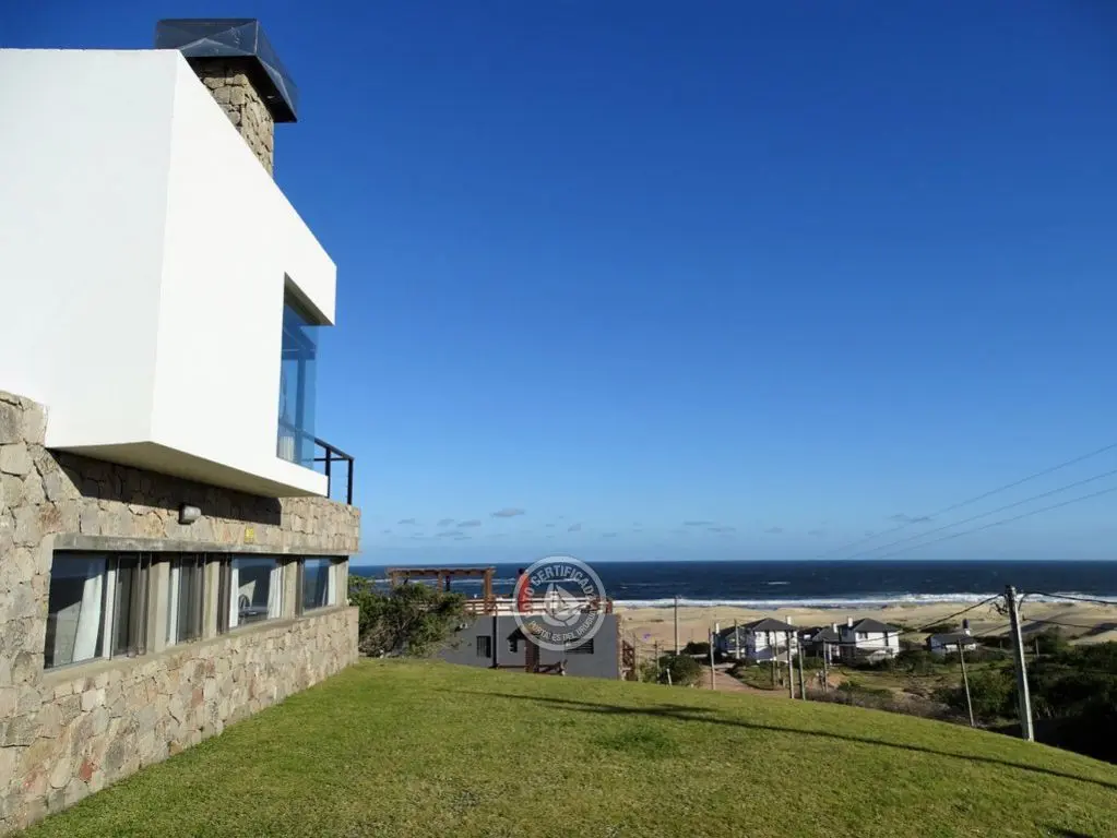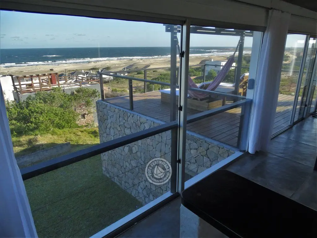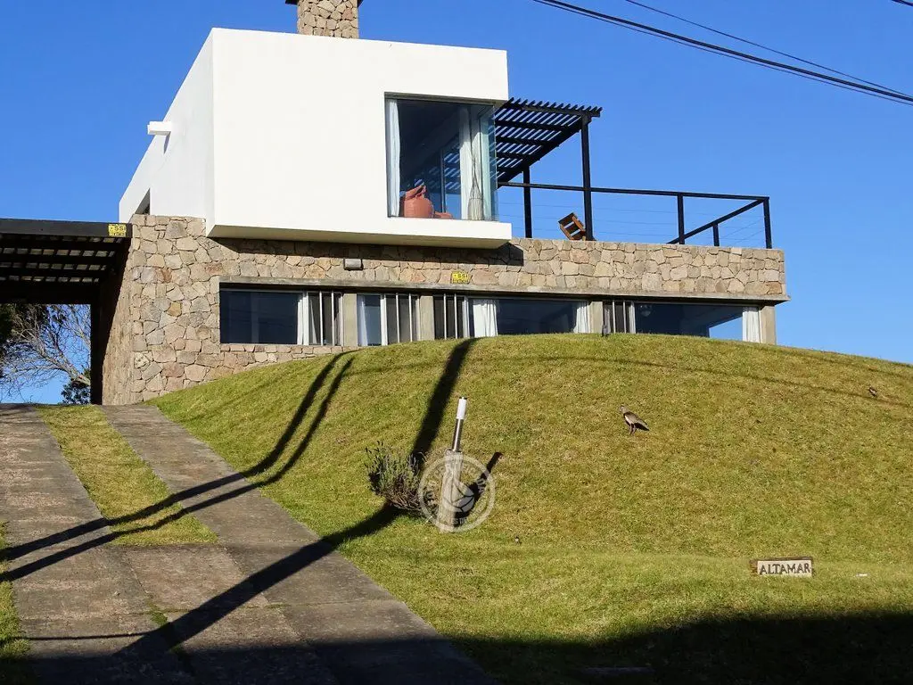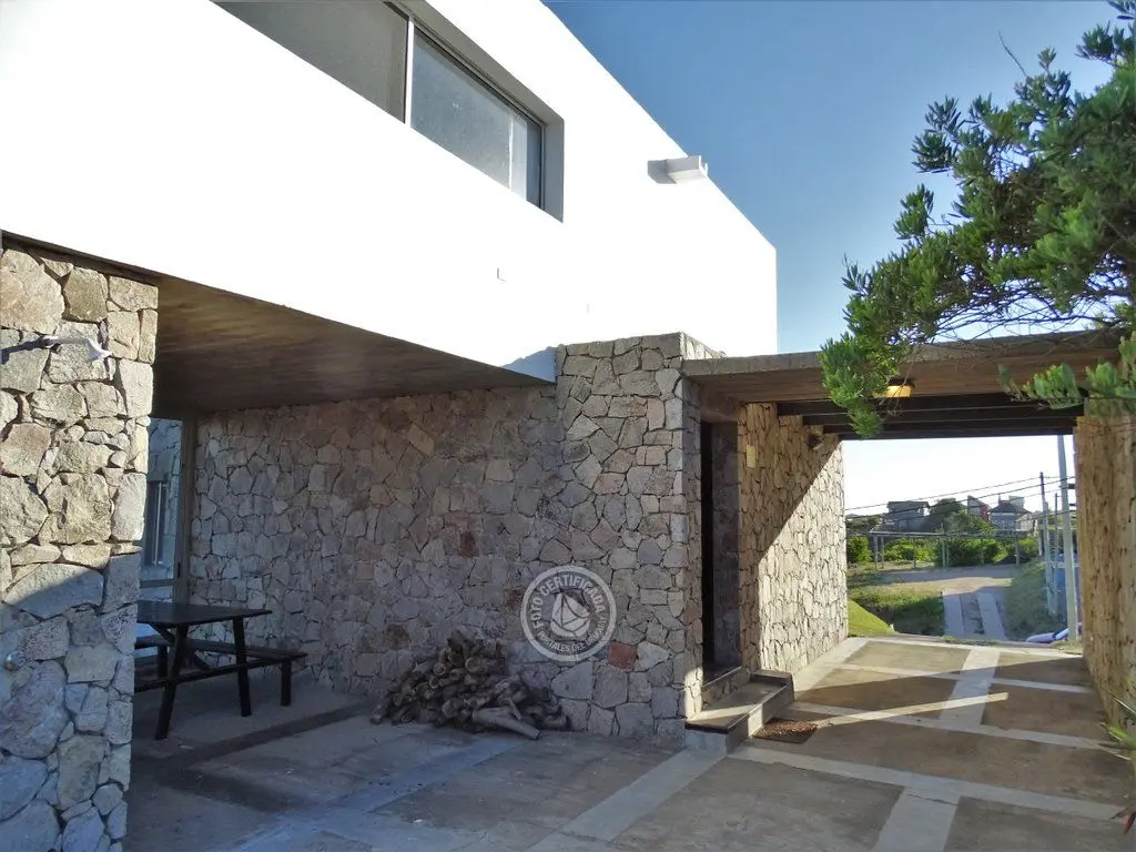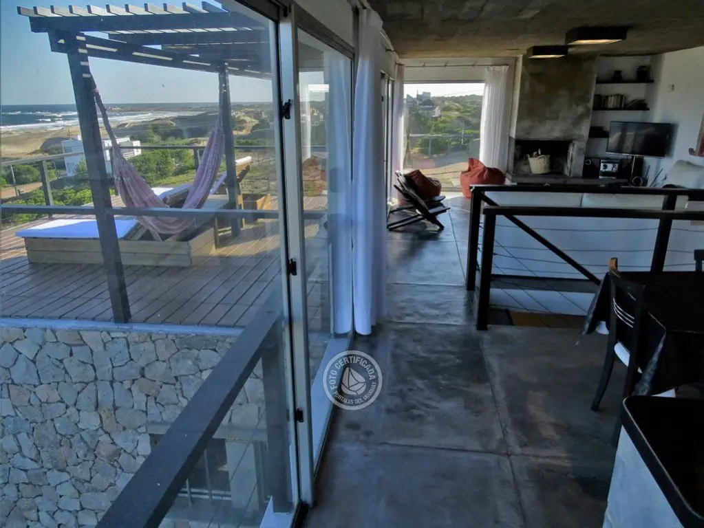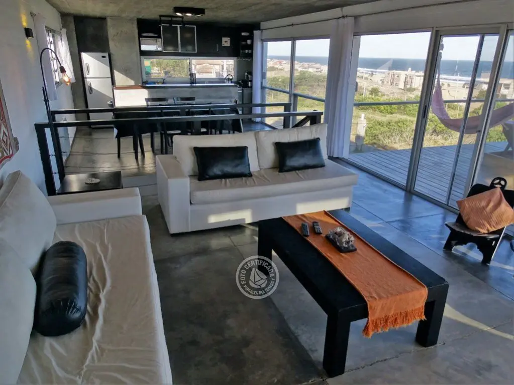 En la plata alta se accede al living con chimenea a a leña, comedor, cocina integrada con barra desayunadora. Cuenta con Importante deck de 6x6 con reposeras, pérgola de madera, amplios ventanales de piso a techo con ángulo de vidrio al faro. La vista no solo se disfruta desde la terraza y a traves de los grandes ventales, sino que debido a la altura por sobre las otras casas, la vista a toda la extensión de la Playa la Viuda está garantizada por el hecho de estar frente a un barranco.
