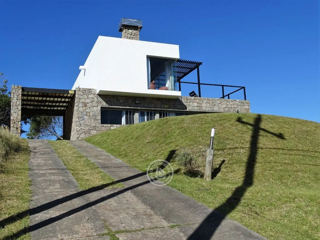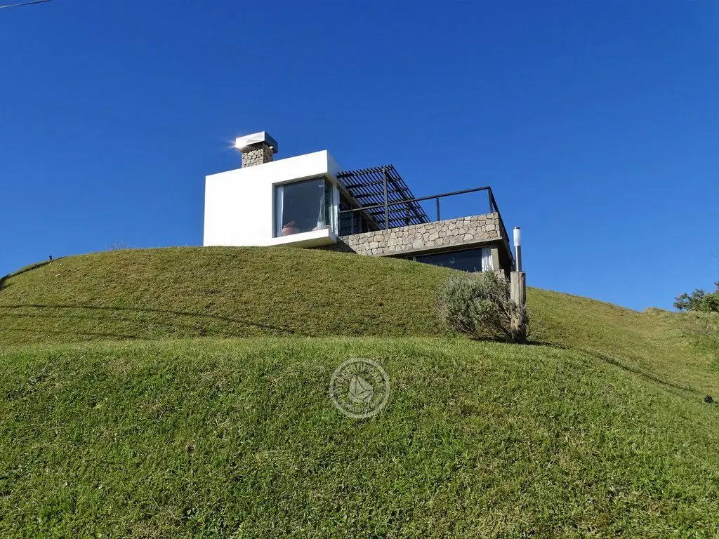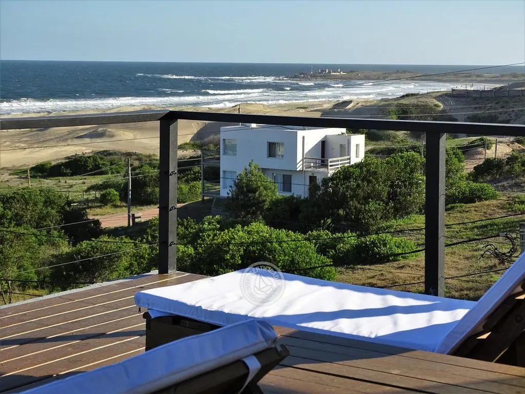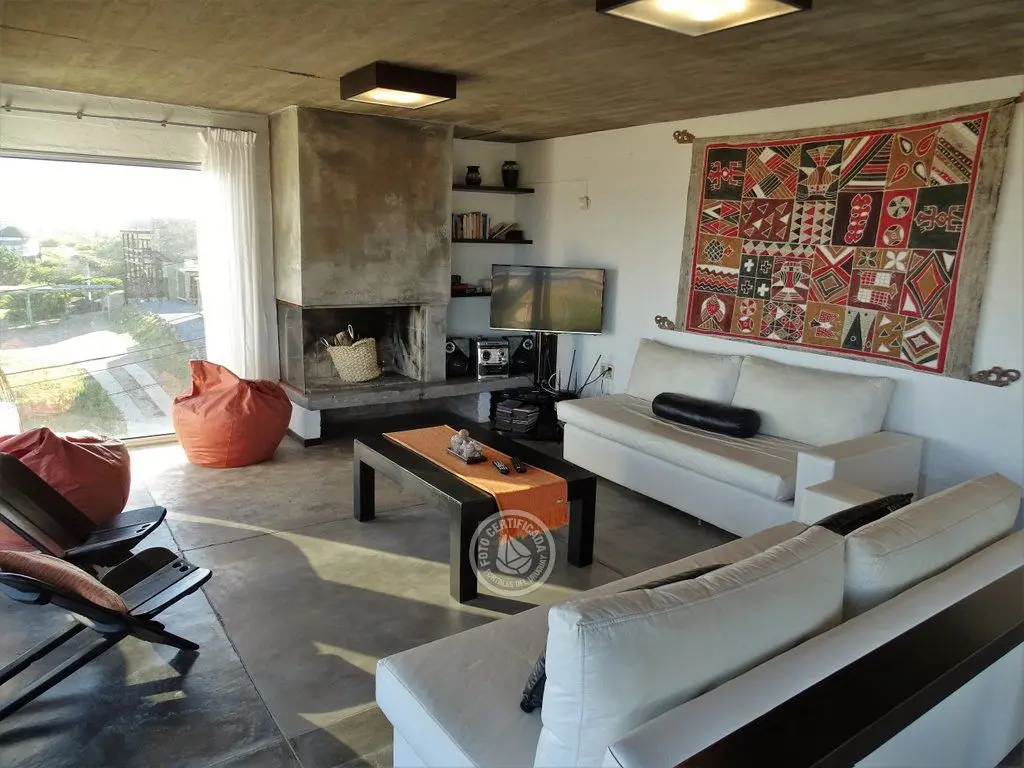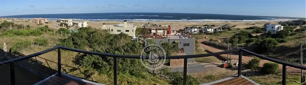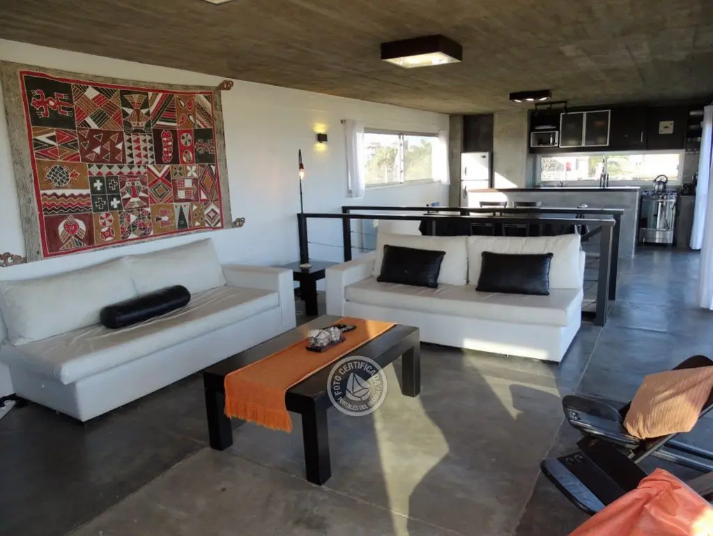 En la plata alta se accede al living con chimenea a a leña, comedor, cocina integrada con barra desayunadora. Cuenta con Importante deck de 6x6 con reposeras, pérgola de madera, amplios ventanales de piso a techo con ángulo de vidrio al faro. La vista no solo se disfruta desde la terraza y a traves de los grandes ventales, sino que debido a la altura por sobre las otras casas, la vista a toda la extensión de la Playa la Viuda está garantizada por el hecho de estar frente a un barranco.