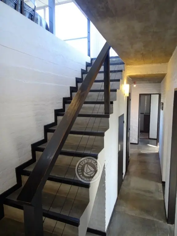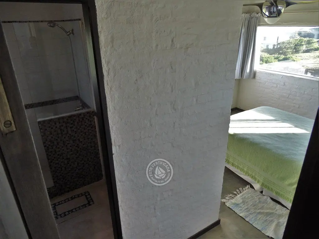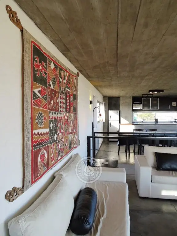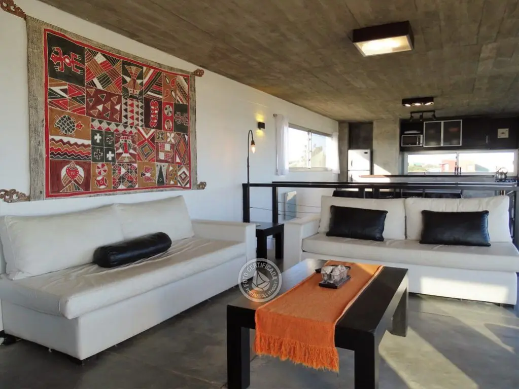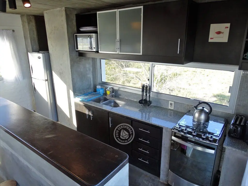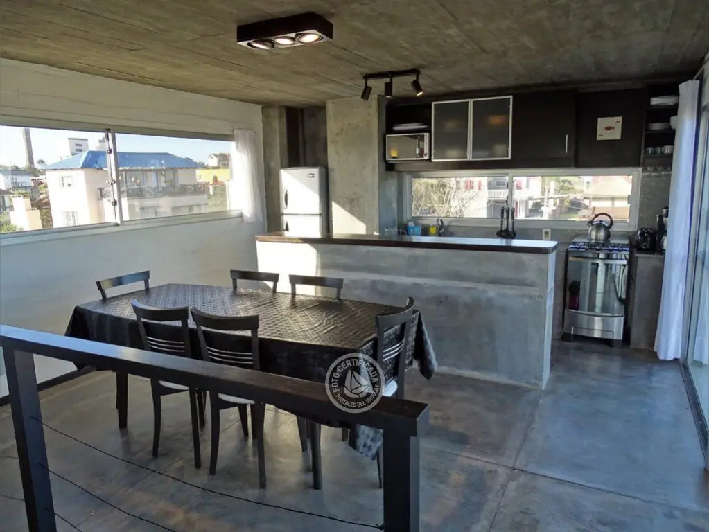 En la plata alta se accede al living con chimenea a a leña, comedor, cocina integrada con barra desayunadora. Cuenta con Importante deck de 6x6 con reposeras, pérgola de madera, amplios ventanales de piso a techo con ángulo de vidrio al faro. La vista no solo se disfruta desde la terraza y a traves de los grandes ventales, sino que debido a la altura por sobre las otras casas, la vista a toda la extensión de la Playa la Viuda está garantizada por el hecho de estar frente a un barranco.