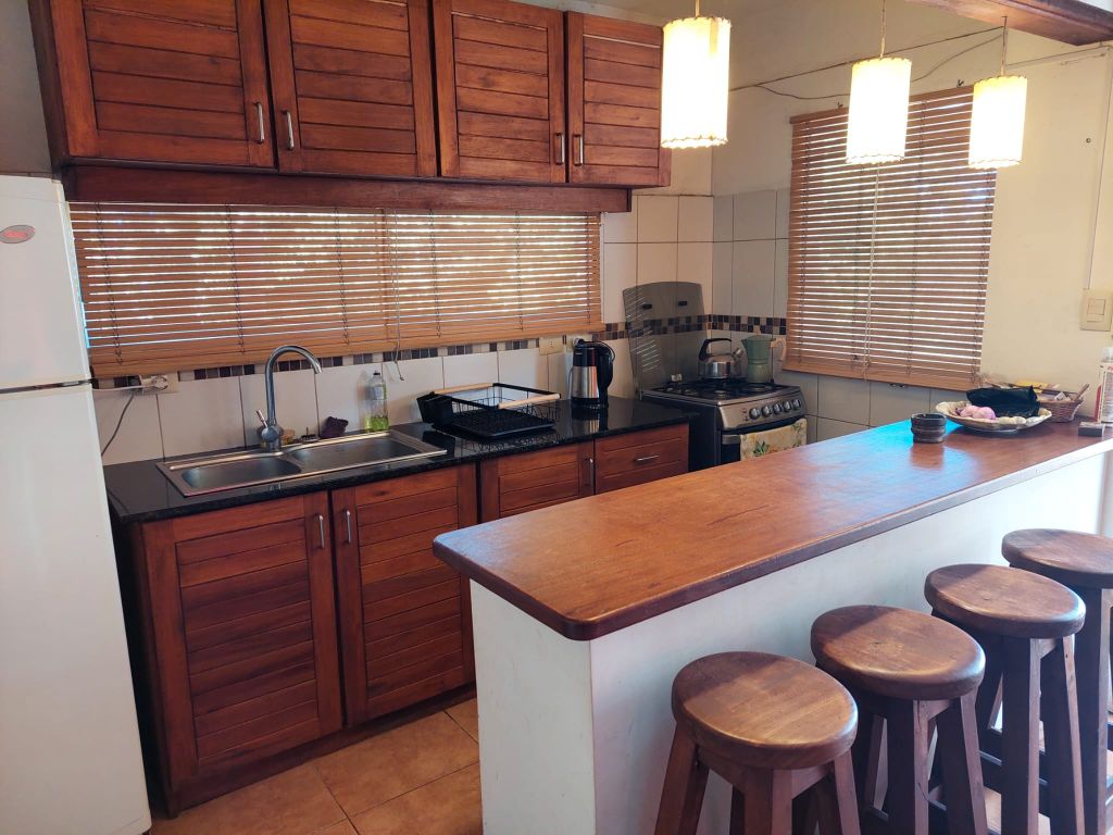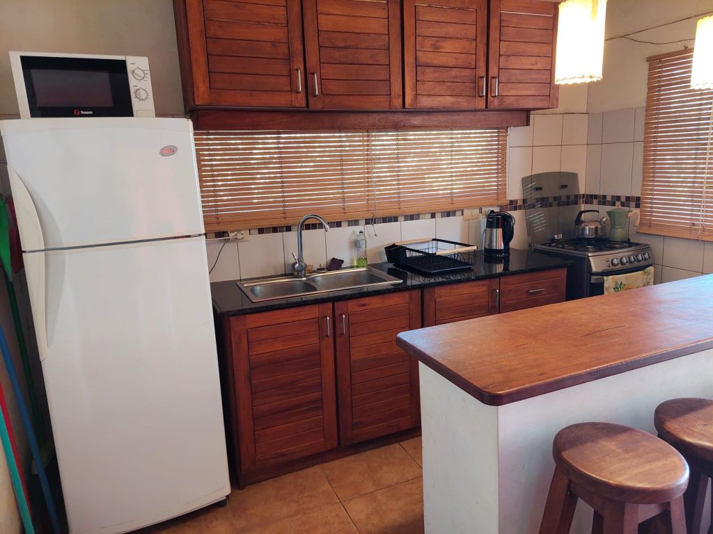 Heladera con freezer, cocina con horno a gas, microondas, jarra eléctrica, cafetera, electrodomésticos y utensilios de cocina. También cuenta con lavarropas, WiFi con fibra óptica, y TV.