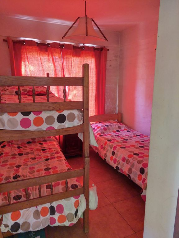 • Planta baja: un dormitorio con tres camas de una plaza con aire acondicionado, baño completo, cocina-comedor y living. En el exterior dispone de parrillero techado, duchero y amplio jardín frontal y trasero.