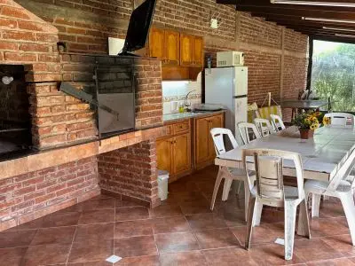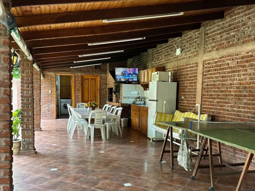 En cuanto a la barbacoa-cochera, de 70 m2, cuenta con baño completo (calefón y lavarropas), cerramiento en pvc enrollable, parrillero, horno pizzero, amplia mesada con placares, vajilla completa, cocinilla, heladera con freezer, microondas, TV Smart , amplia mesada revestida, hamaca, mesa de ping pong, bicicletas, reposeras, sillas de playa, etc.