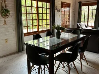 Predio totalmente independiente y cerrado. La casa es muy fresca y bien iluminada, con 4 dormitorios, para 9 personas, con jardín al frente y gran fondo. Amplia barbacoa con baño completo, totalmente equipada .