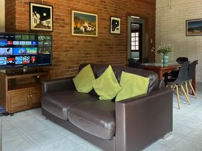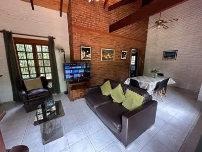 Totalmente seguro para niños y mascotas. Buen espacio en el frente y gran fondo verde. La casa de aprox. 120 m2 es muy fresca e iluminada. Cuenta con 3 aires acondicionado.