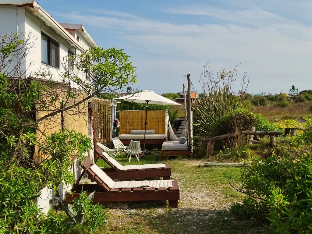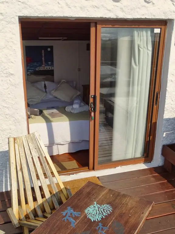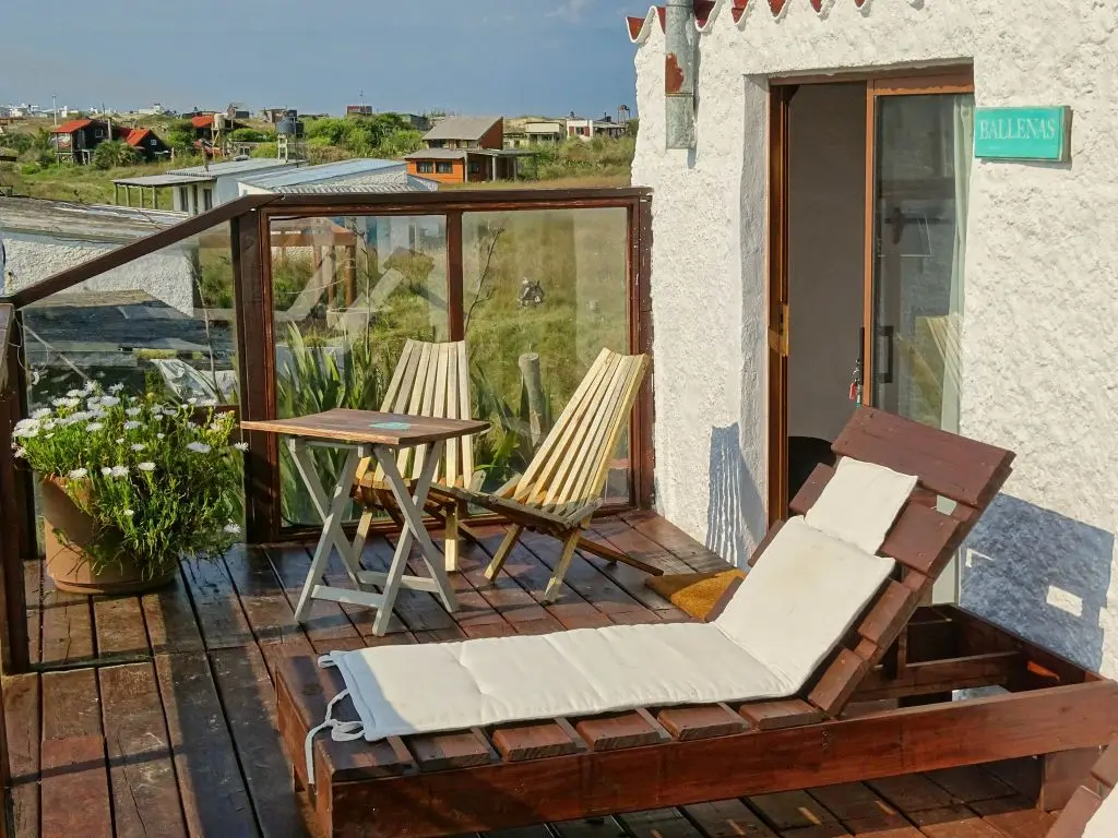 Suite Ballenas, pueden alojarse hasta 3 personas (recomendamos 2 adultos y niño) ya que tiene una cama matrimonial y un catre chico. Equipada con ropa de cama, toallas, sombrillas y reposeras de playa.