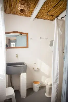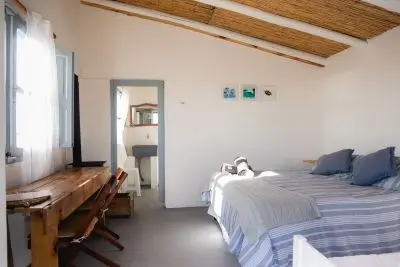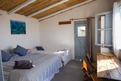 Suite Tortugas: pueden alojarse hasta 4 personas, Tiene cama matrimonial y una cama marinera. Equipada con ropa de cama, toallas, sombrillas y reposeras de playa. Baño privado completo con ducha.
