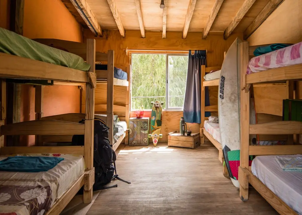 Habitaciones compartidas para 8 personas, mixtas o femeninas. Desayuno, cocina, lockers, sábanas. Clases de surf y alquiler de tablas, trajes y bicis.