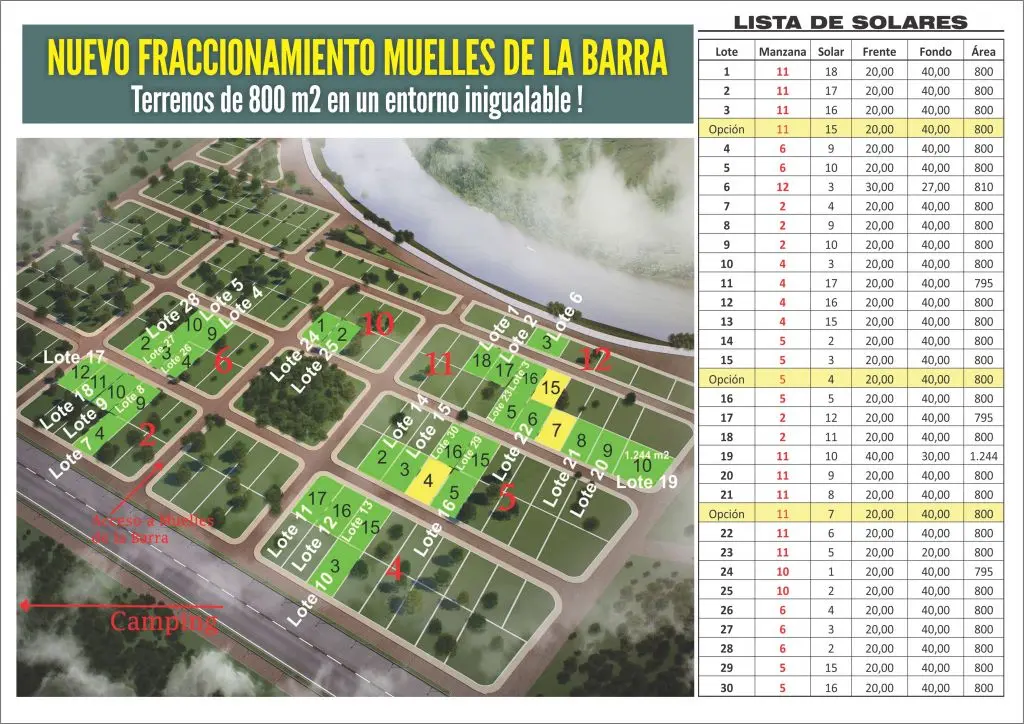 30 Solares de 800 metros cuadrados en el fraccionamiento Muelle de la Barra junto al Arroyo Chuy y a 6 cuadras de la playa