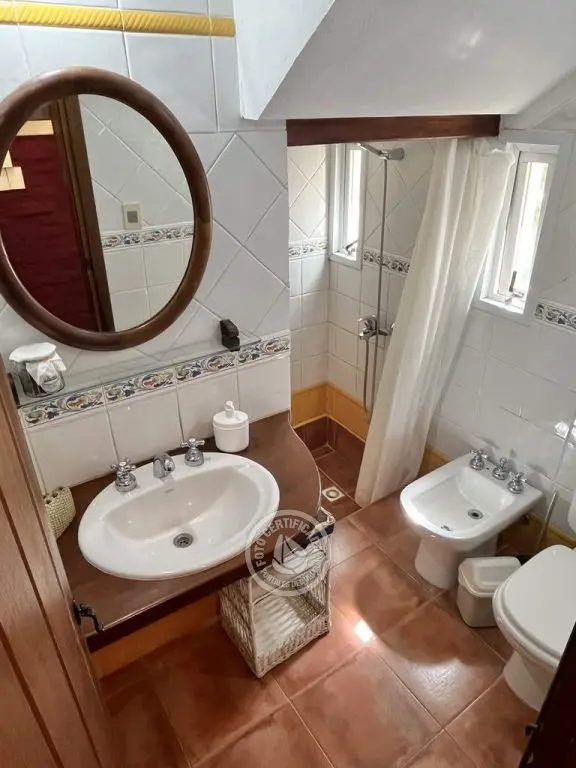 La planta superior preserva la intimidad del dormitorio principal en suite con aire acondicionado y presidido por un enorme ventanal que ocupa prácticamente toda la pared y da salida a una agradable terraza de 21 mts. con pérgola y reposeras, con una disfrutable vista al cerro. La suite consta de vestidor, baño con bañera y duchero independientes con grandes ventanales.