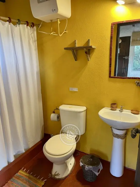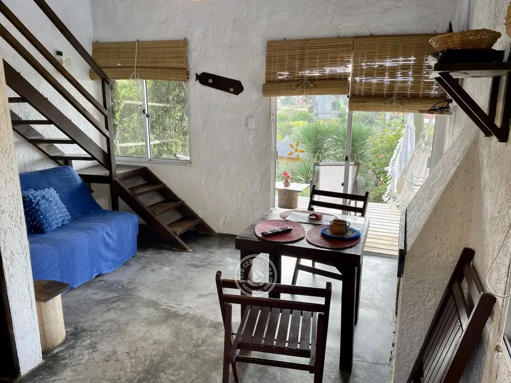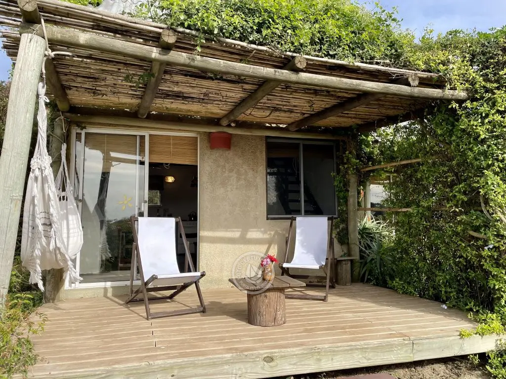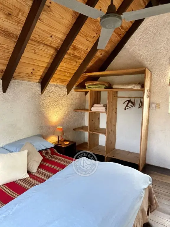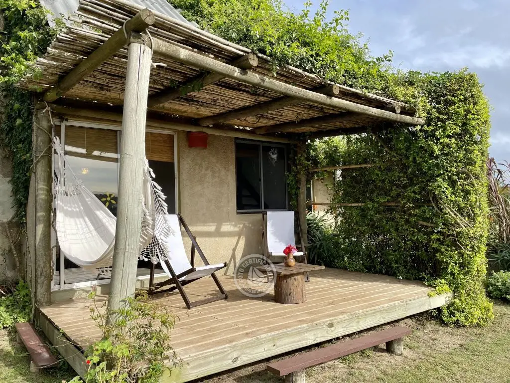 Cada cabaña tiene comodidad para dos o tres adultos o una pareja con dos niños chicos. Son estilo loft con entrepiso de madera, en planta alta esta la cama matrimonial, con amplio placard y balcón donde se pueden apreciar los atardeceres. La planta baja es un ambiente integrado, con un sofá cama de plaza y media, lugar de estar, cocina y baño.