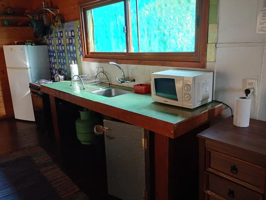 Cocina equipada: heladera con freezer, cocina a supergas con horno, microondas, jarra eléctrica, cafetera francesa, tostadora y vajilla.