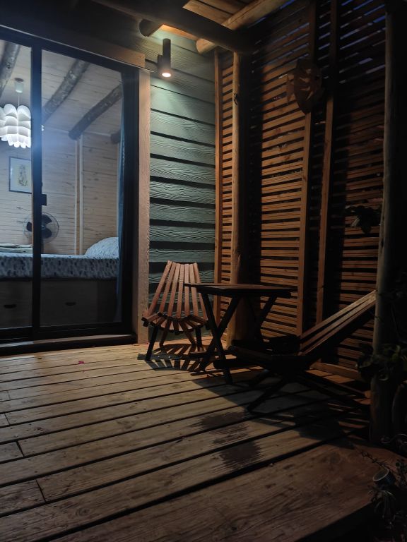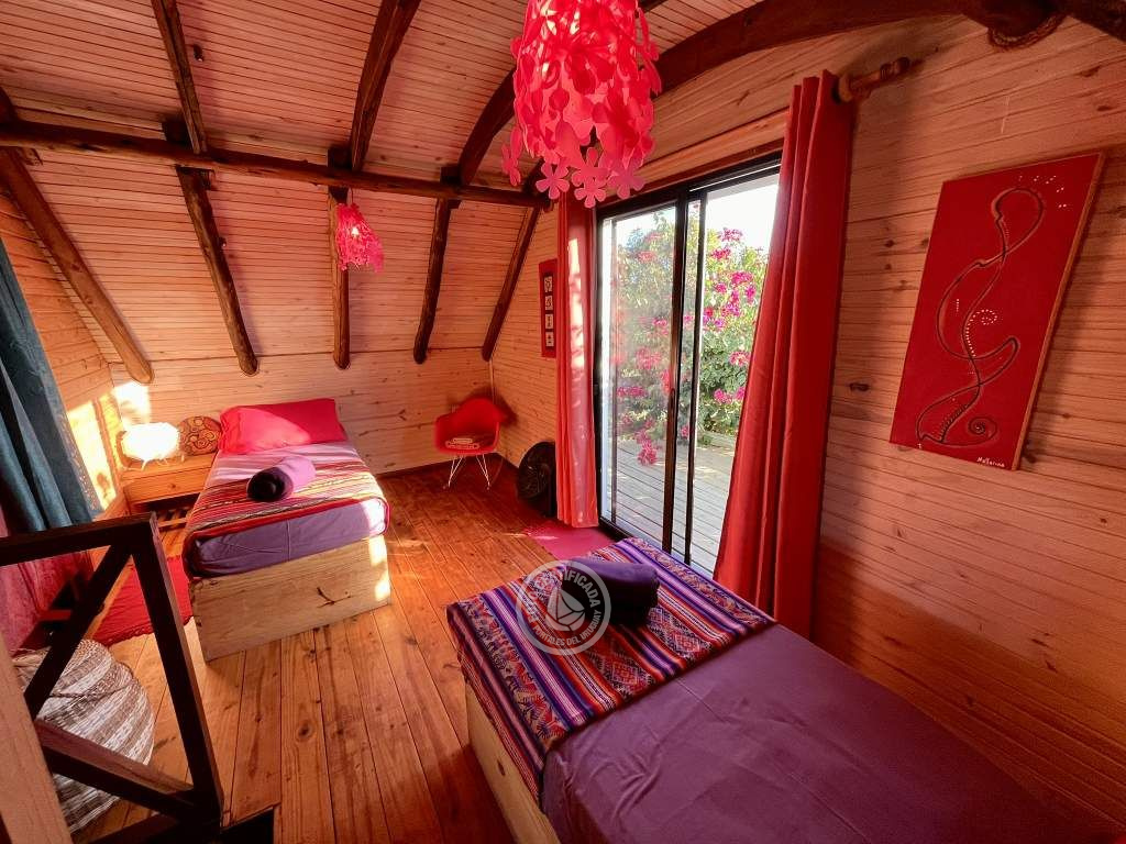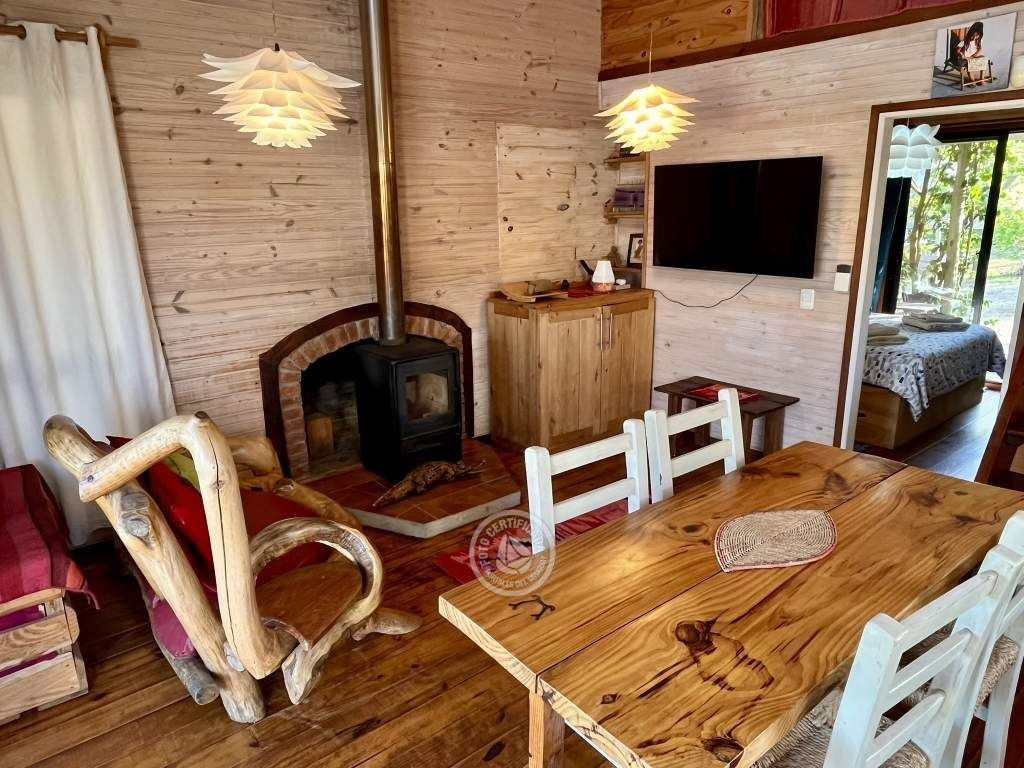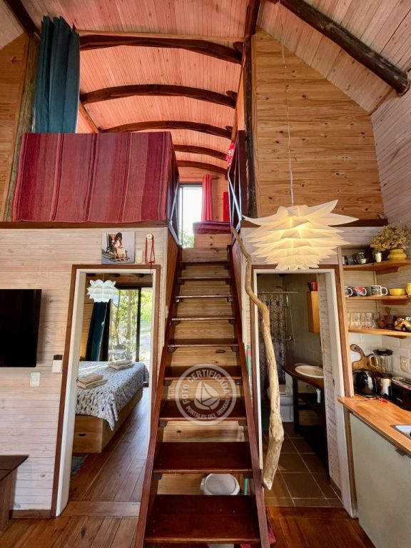 Cabaña de techo curvo con entrepiso y estufa a leña para 2 a 4 personas.