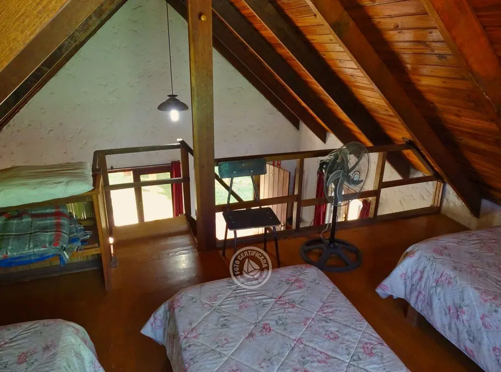 Entrepiso con 3 camas simples y dormitorio abajo con 1 cama doble.