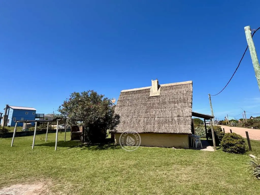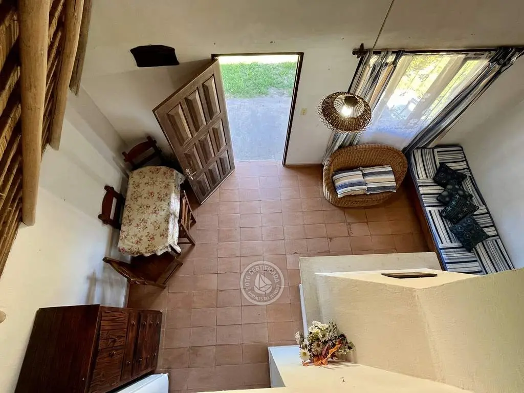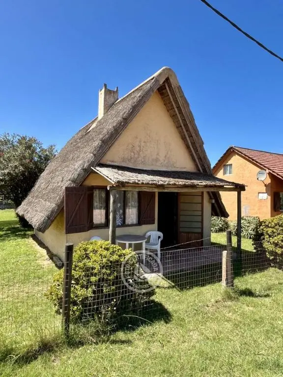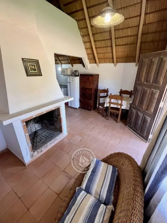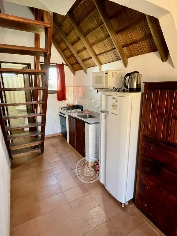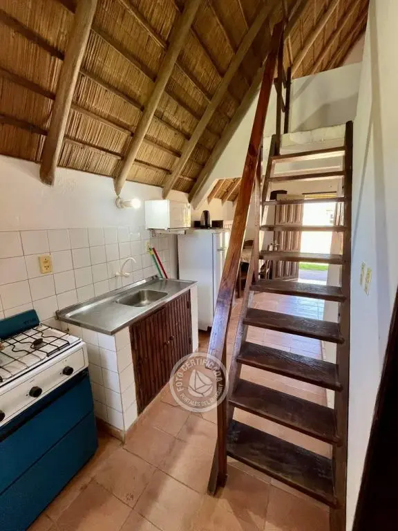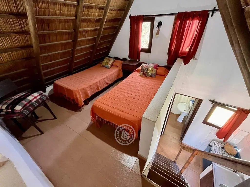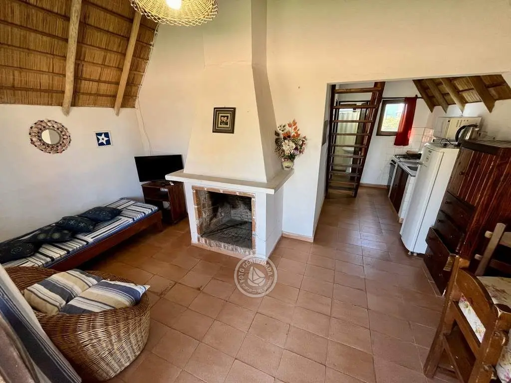 Cabaña de material con techo de quincho. Planta baja con living comedor con cocina integrada, dormitorio con cama doble y baño. Entrepiso con 2 camas simples. Parrillero al fondo.