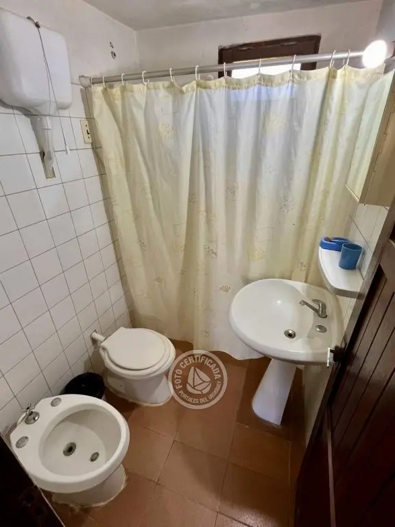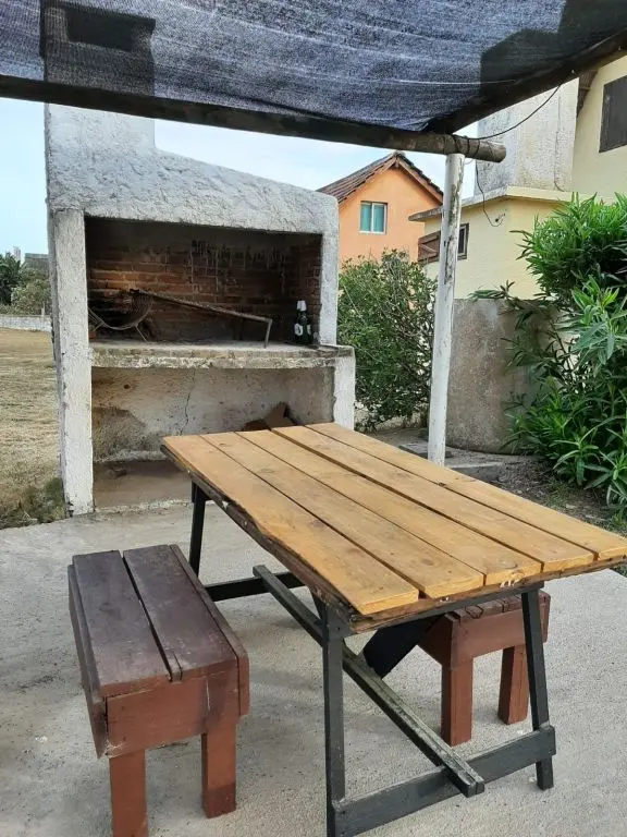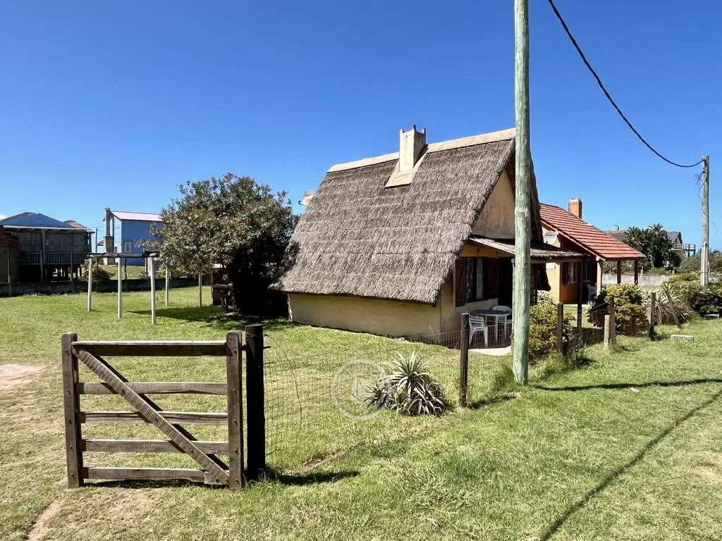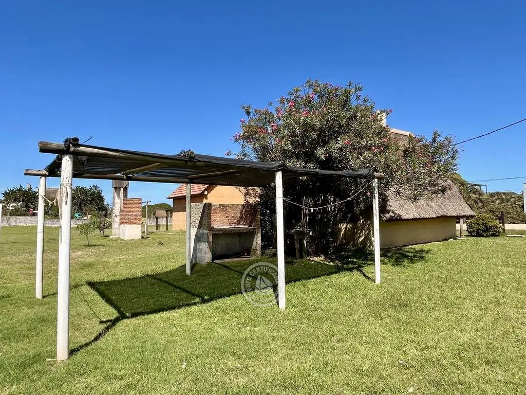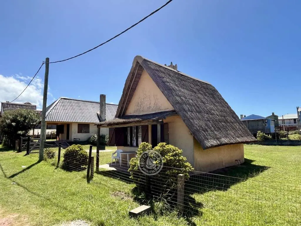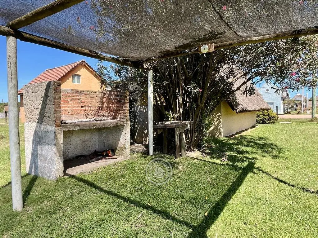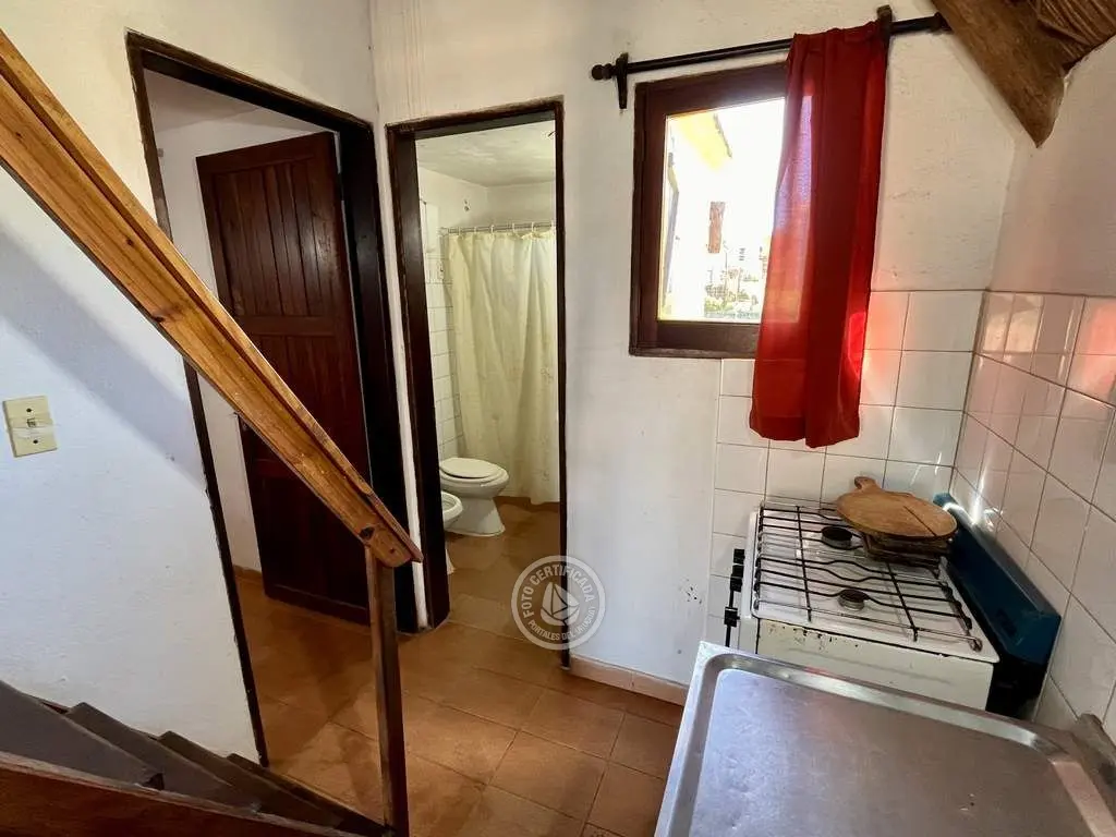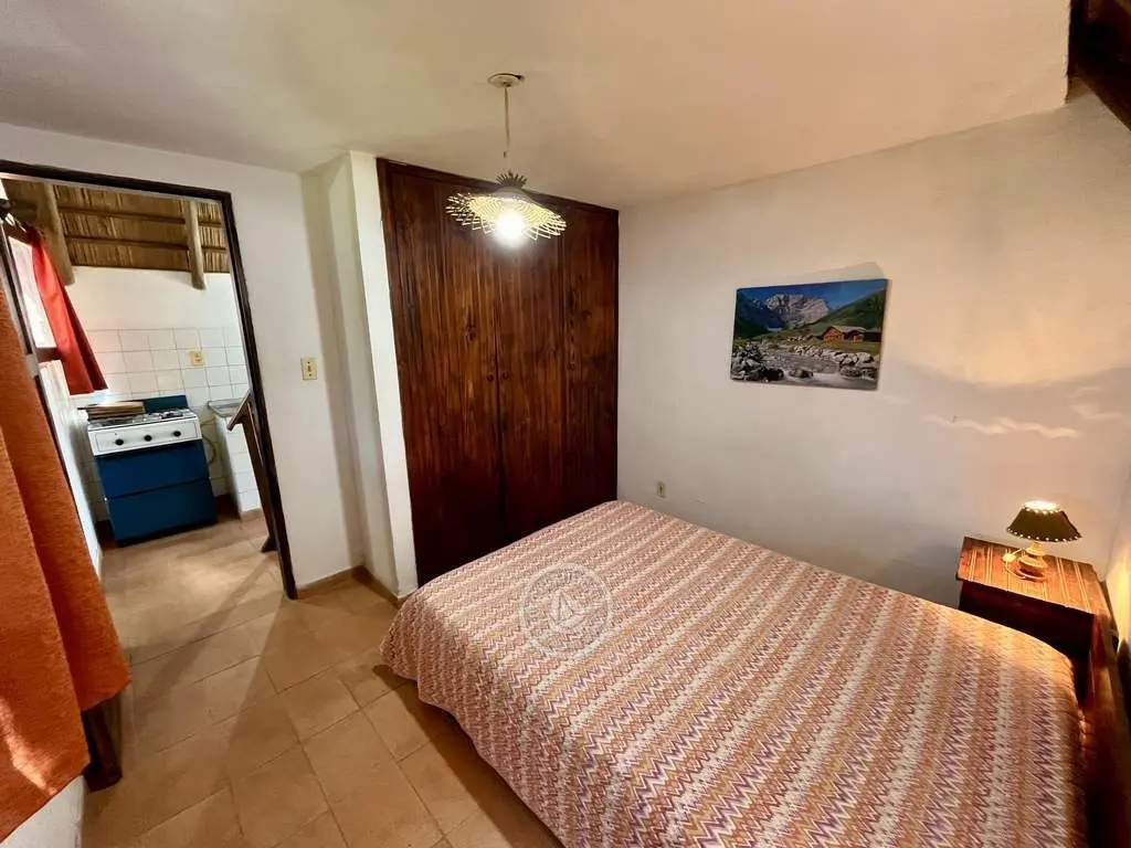 Cabaña de material con techo de quincho. Planta baja con living comedor con cocina integrada, dormitorio con cama doble y baño. Entrepiso con 2 camas simples. Parrillero al fondo.