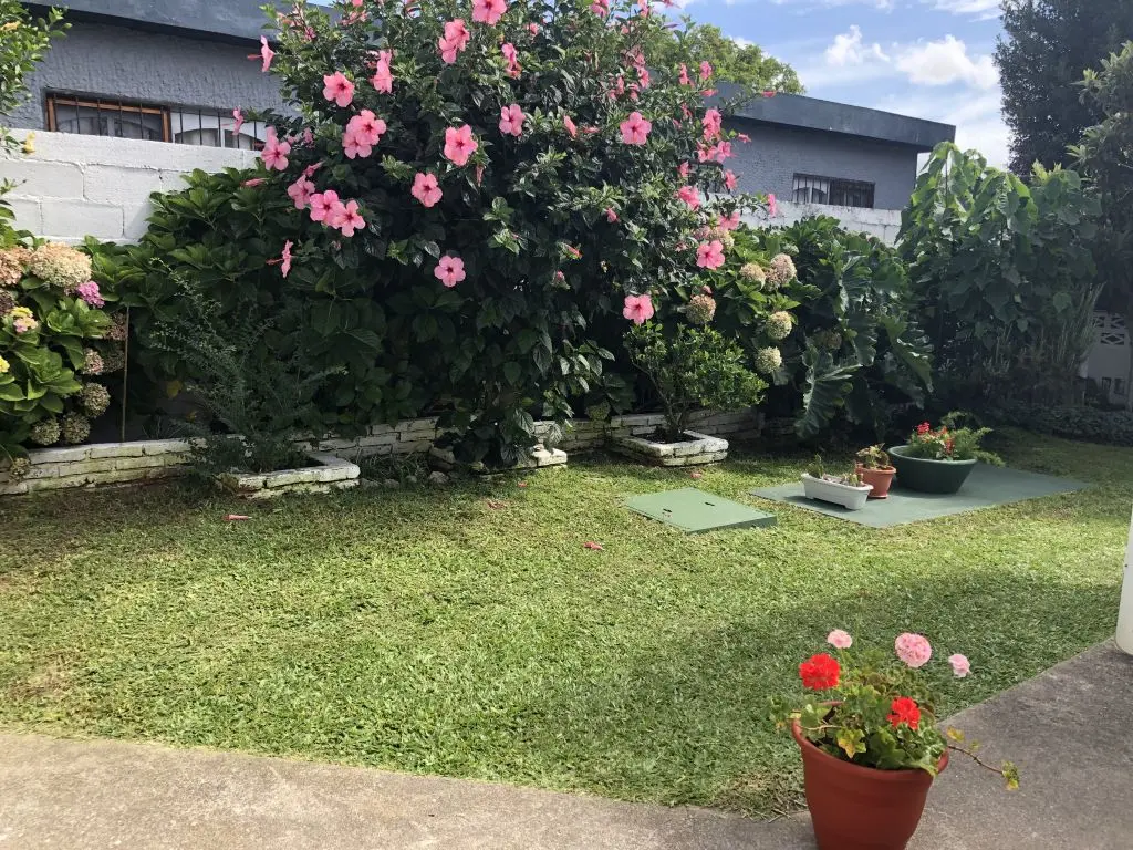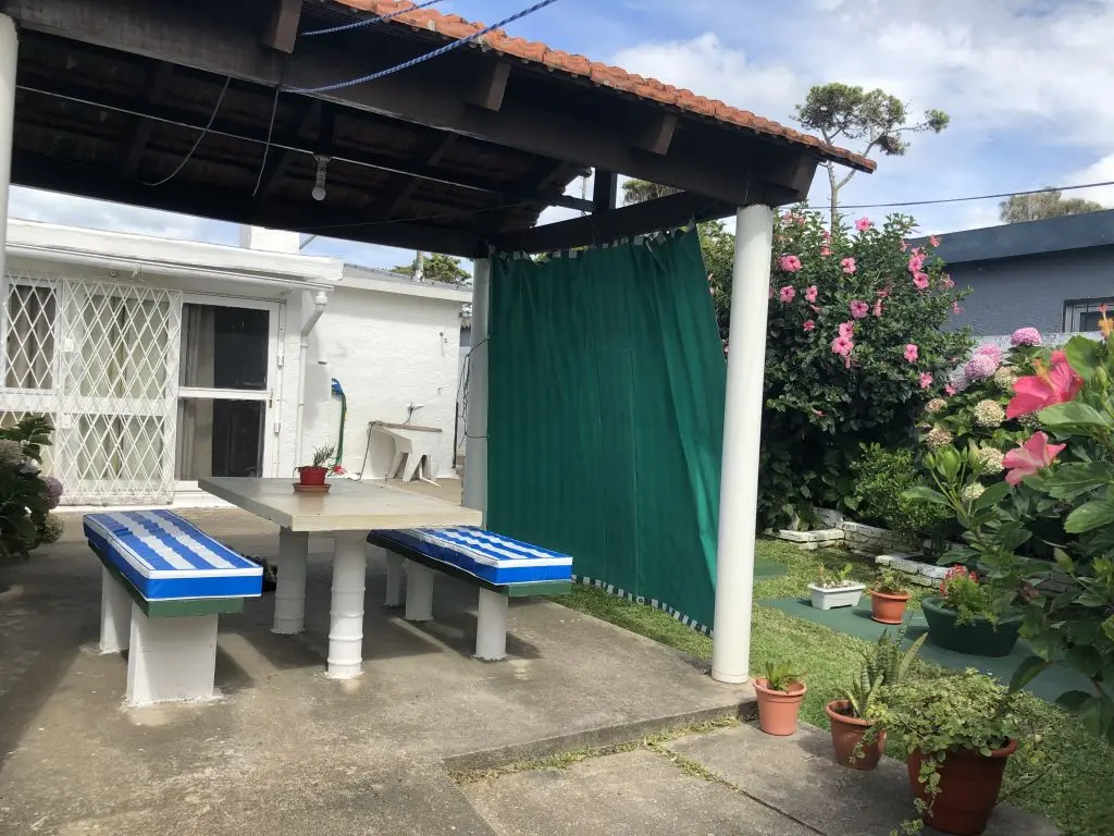 Mesa y bancos en jardín y parrillero.
