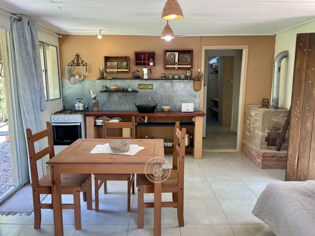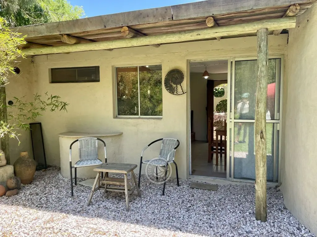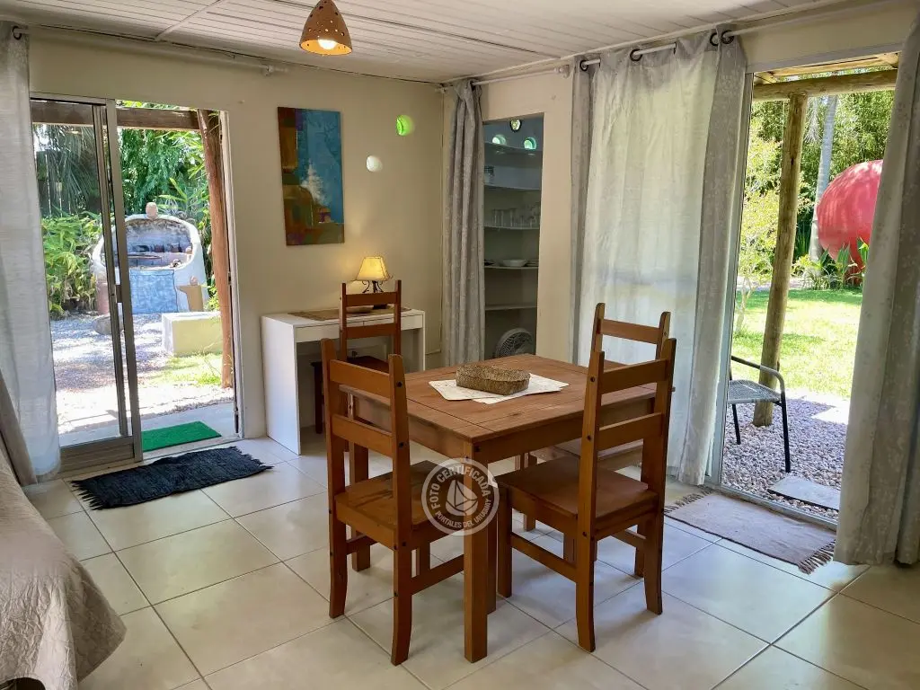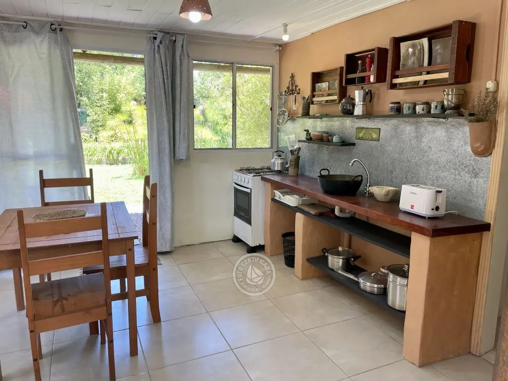 Georgicas tiene un dormitorio con cama matrimonial, en él está el aire acondicionado. Luego hay una pequeña habitación que comunica con el baño. Este tiene ducha caliente,su calefón es eléctrico. La cocina-comedor es amplia,hay una mesa de madera y un sillón cama (futón) de dos plazas en el que pueden dormir cómodamente 2 personas. Esta habitación comunica con la despensa,(donde están los utensillos de cocina y puedes guardar alimentos),tiene una puerta vidriada que da a un gran espacio enjardinado, otra puerta, tambien de vidrio, corrediza,que da a un parrillero y una tercera puerta de madera que comunica con el patio interno cubierto por un parral. En él hay una hamaca y la cuerda de colgar ropa.