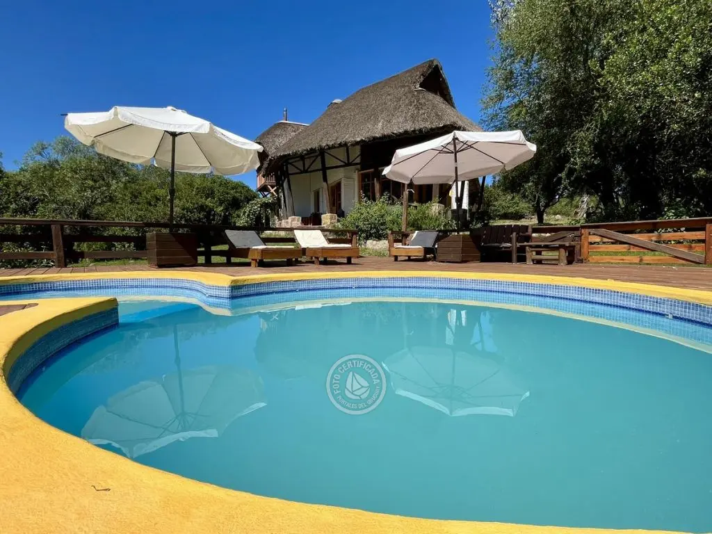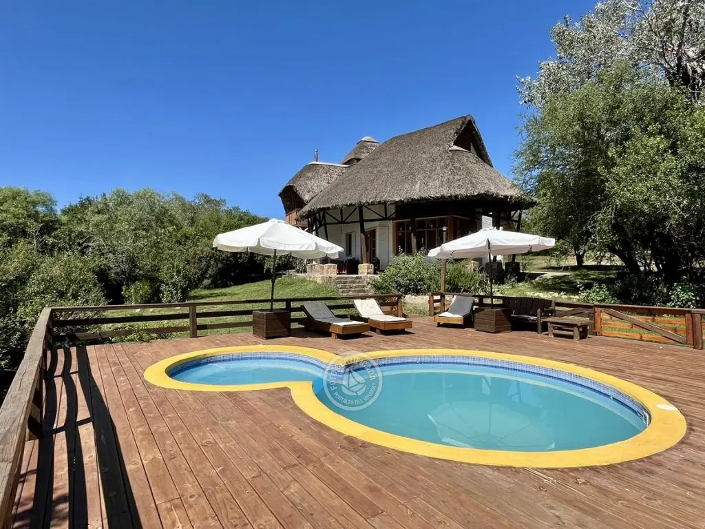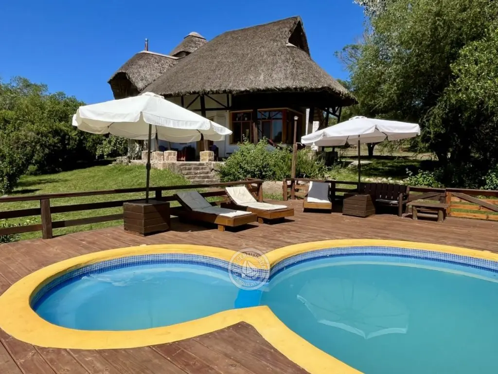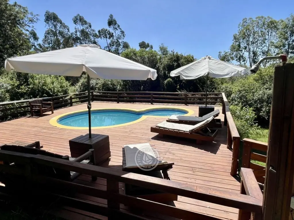 piscina para adultos y niños (con hidromasajes), y amplio deck con reposeras con colchonetas, sombrillones, bancos y mesa todo en madera