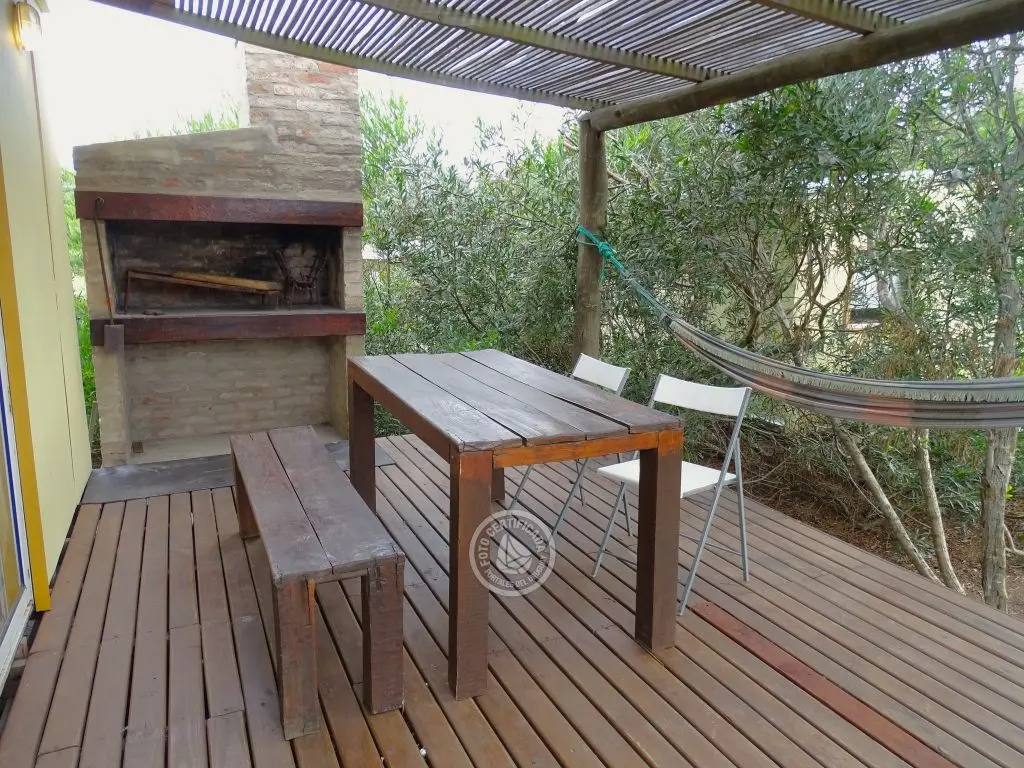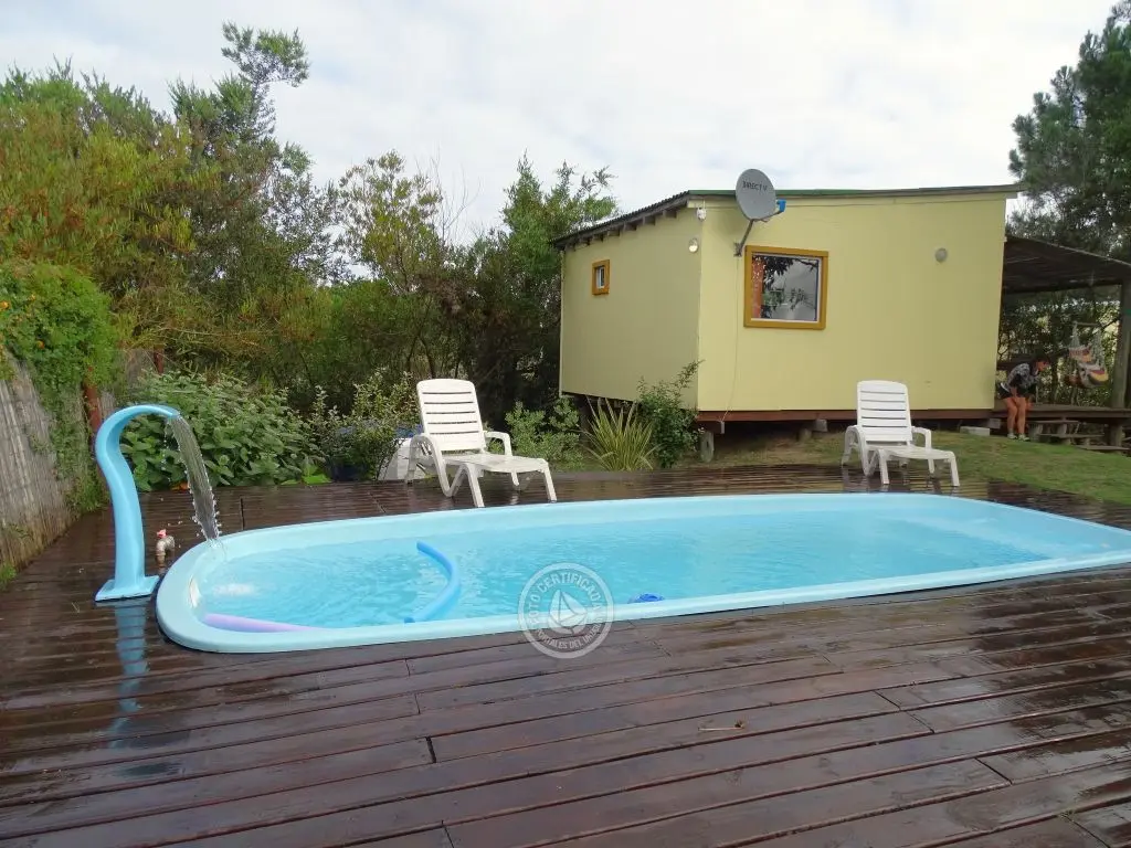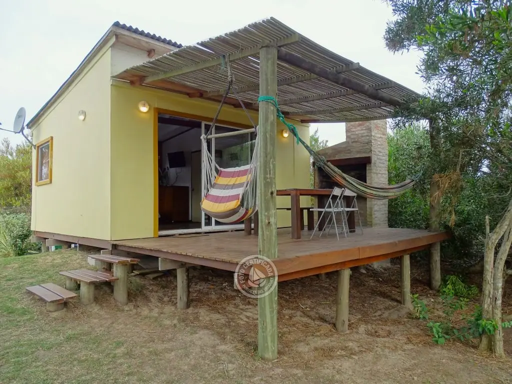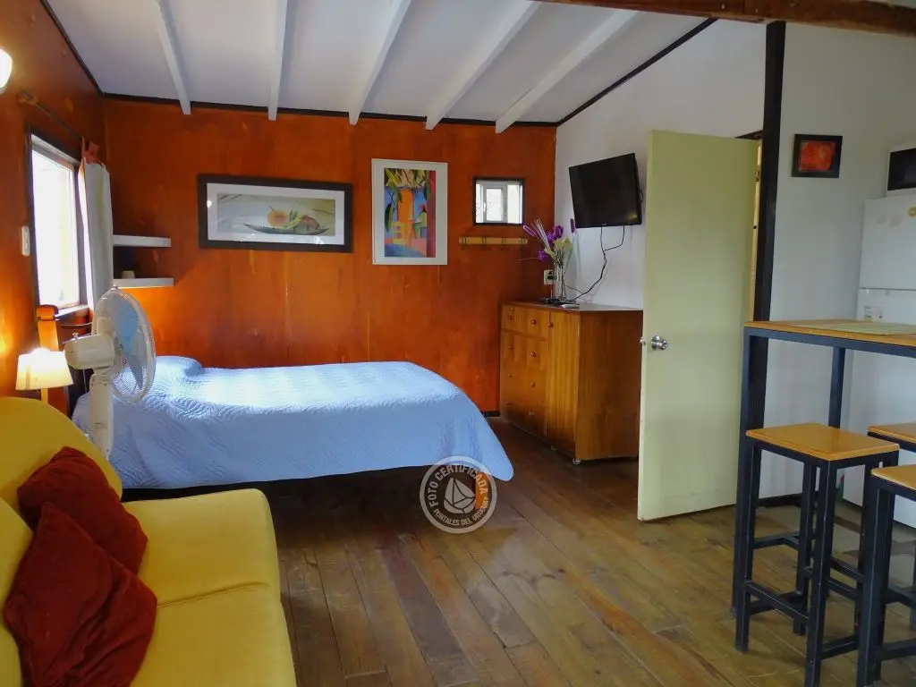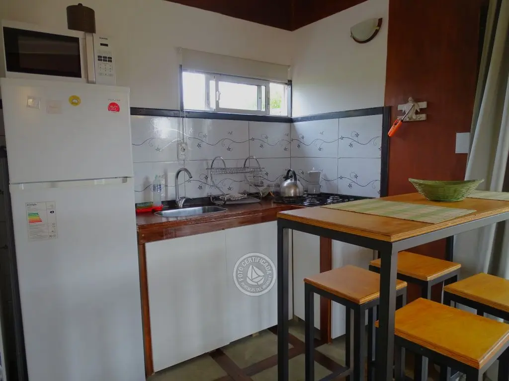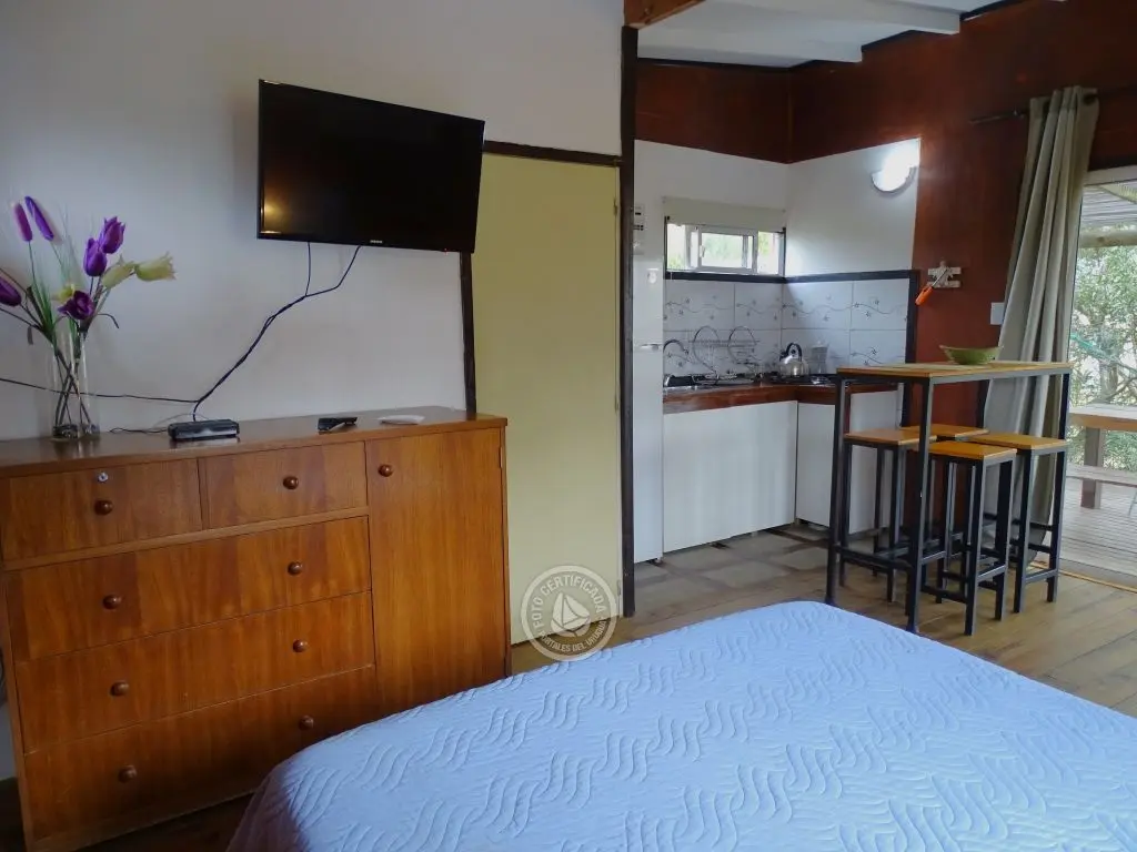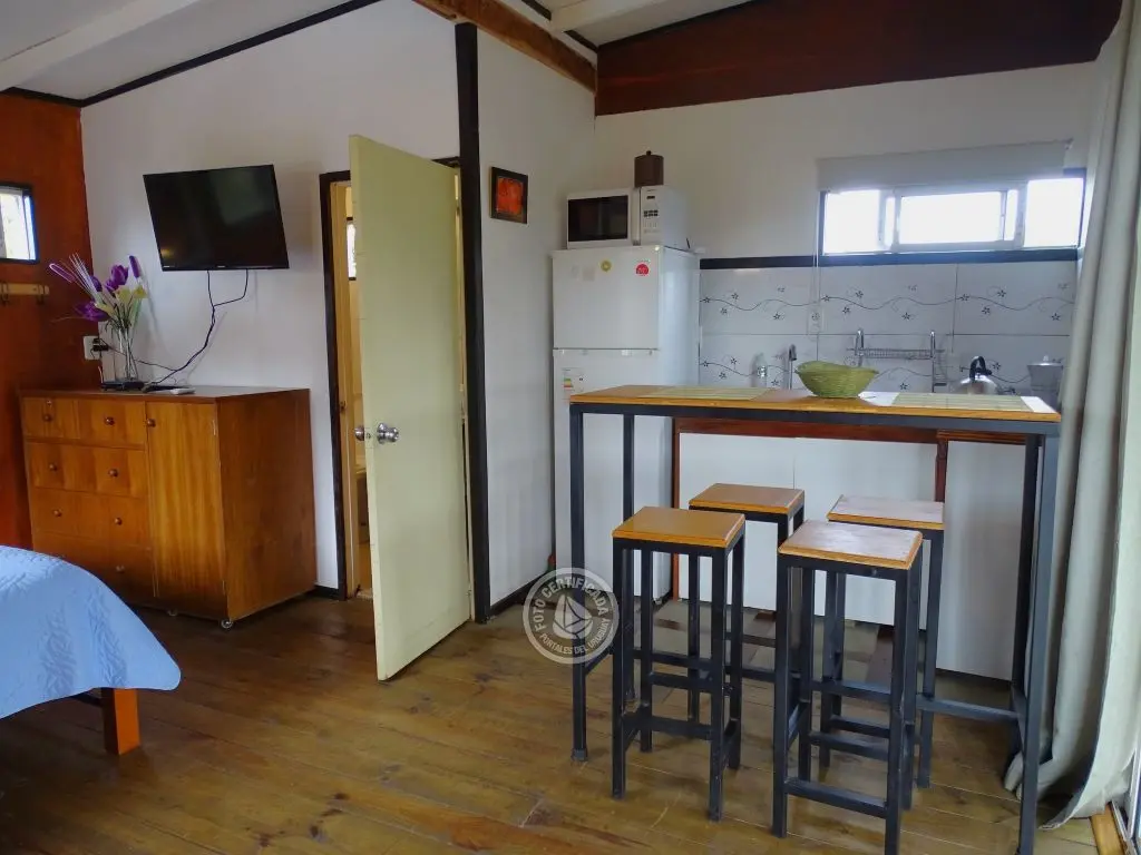 Cuebta con tres cabañas monoambientes, cada una con cama matrimonial, sofa cama, deck con parrillero, mesada y bancos.