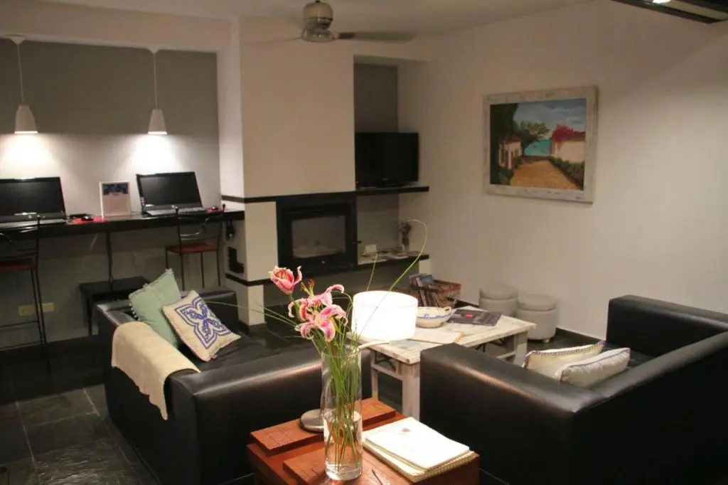 La Posada El Capullo cuenta con una zona integrada de ordenadores con monitores de pantalla plana y sillas de bar en el salón, decorado con tonos marrones, muebles blancos y detalles de arte contemporáneo.